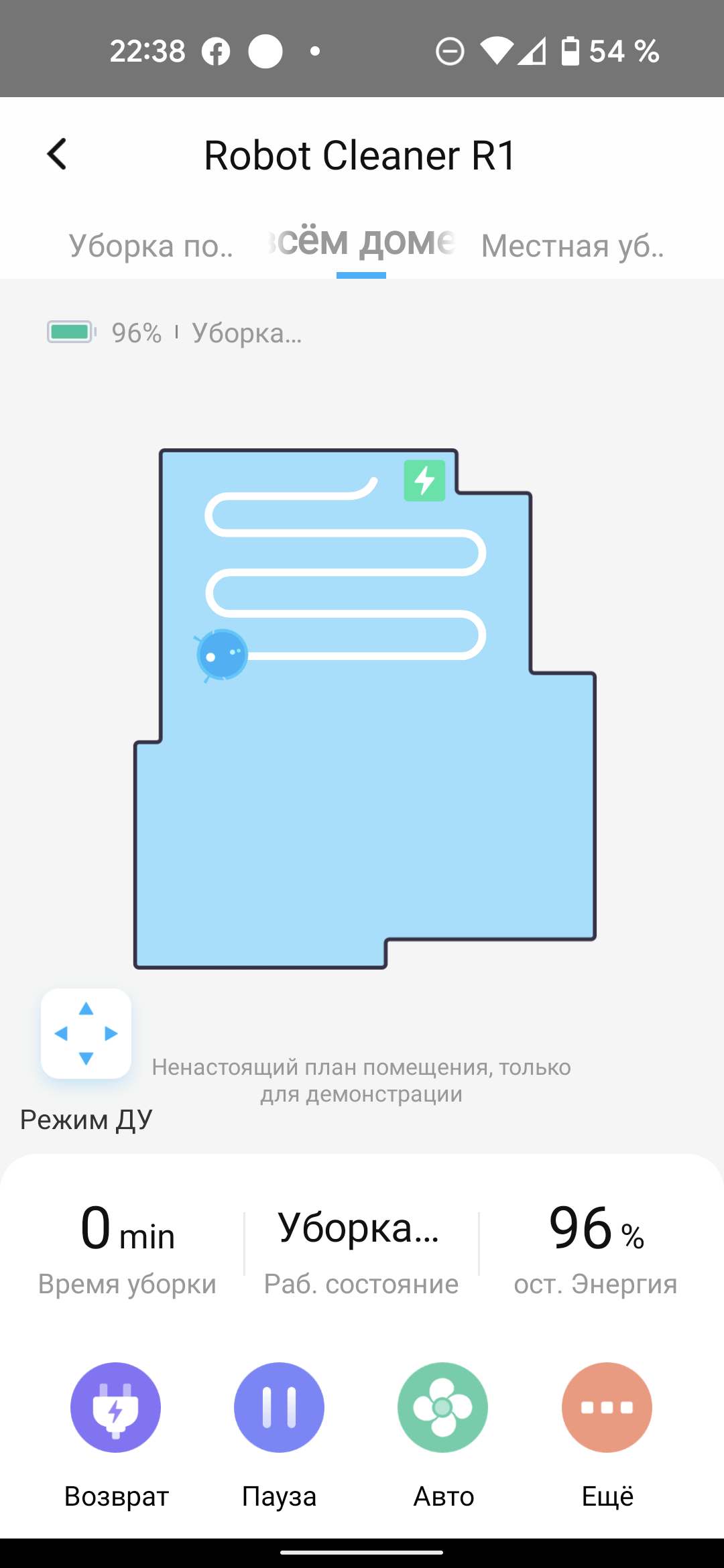 Вторая страница приложения значительно информативнее: тут видны текущий заряд аккумулятора, состояние устройства и карту уборки, если пылесос сейчас работает. Последняя, к сожалению, не соответствует действительности: на ней не отражаются ни реальная конфигурация помещения, ни маршрут робота, ни местоположение базы: перед нами просто большая анимированная иконка. Надпись мелким шрифтом объясняет, что изображение карты помещено здесь «только для демонстрации».