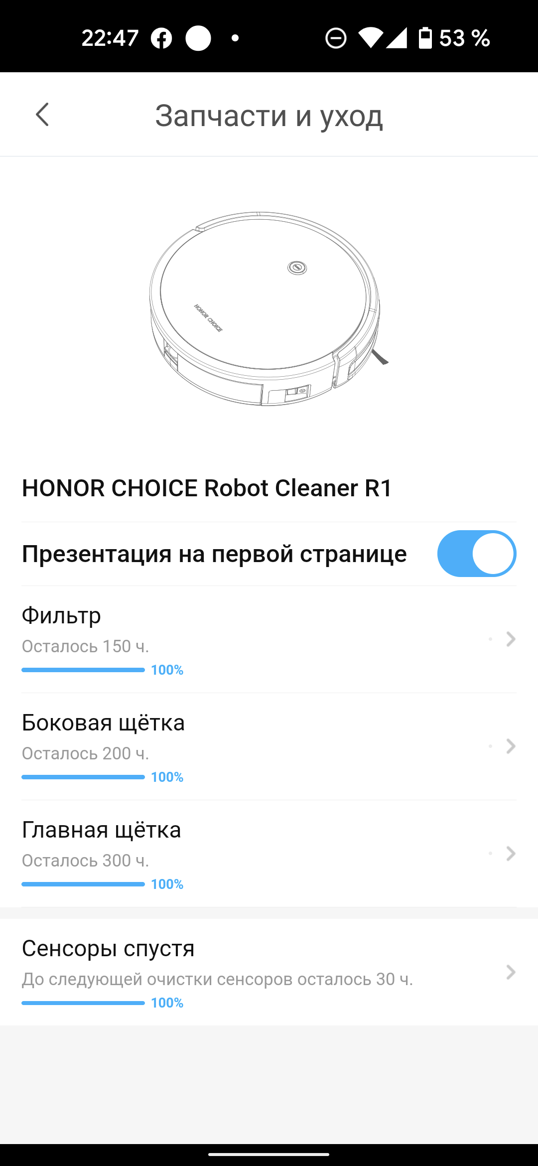 Мобильное приложение сигнализирует пользователю, когда ресурс фильтров или щеток будет исчерпан, после чего надо заменить нужную комплектующую.
