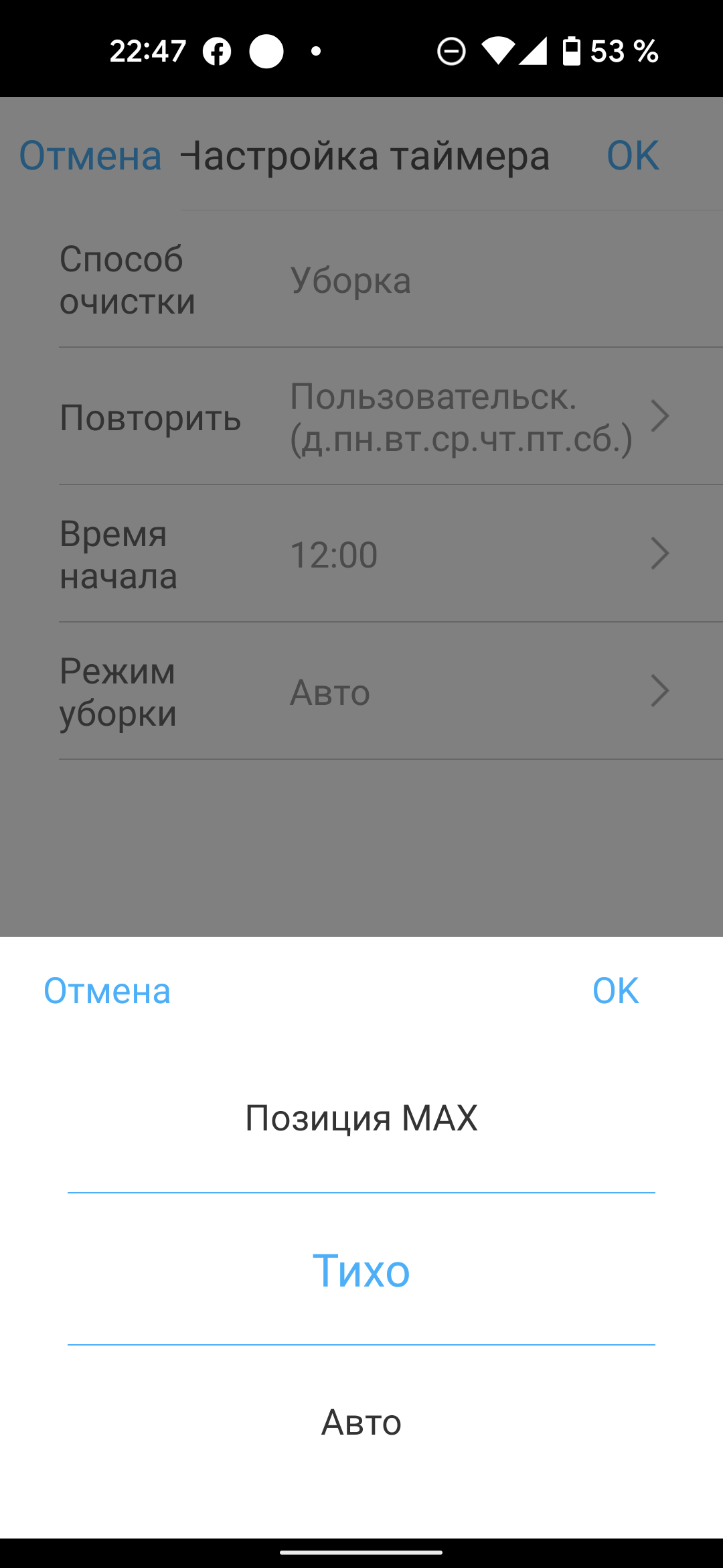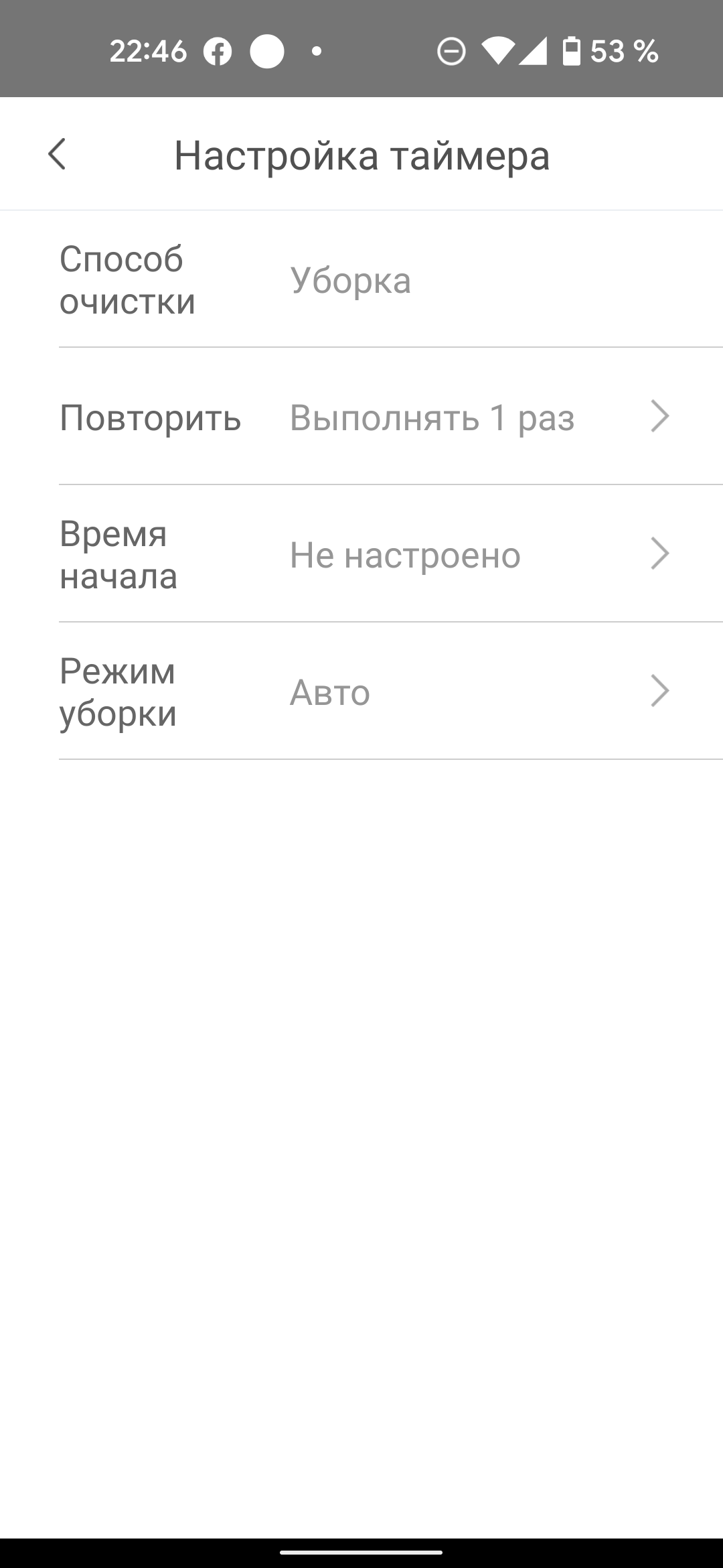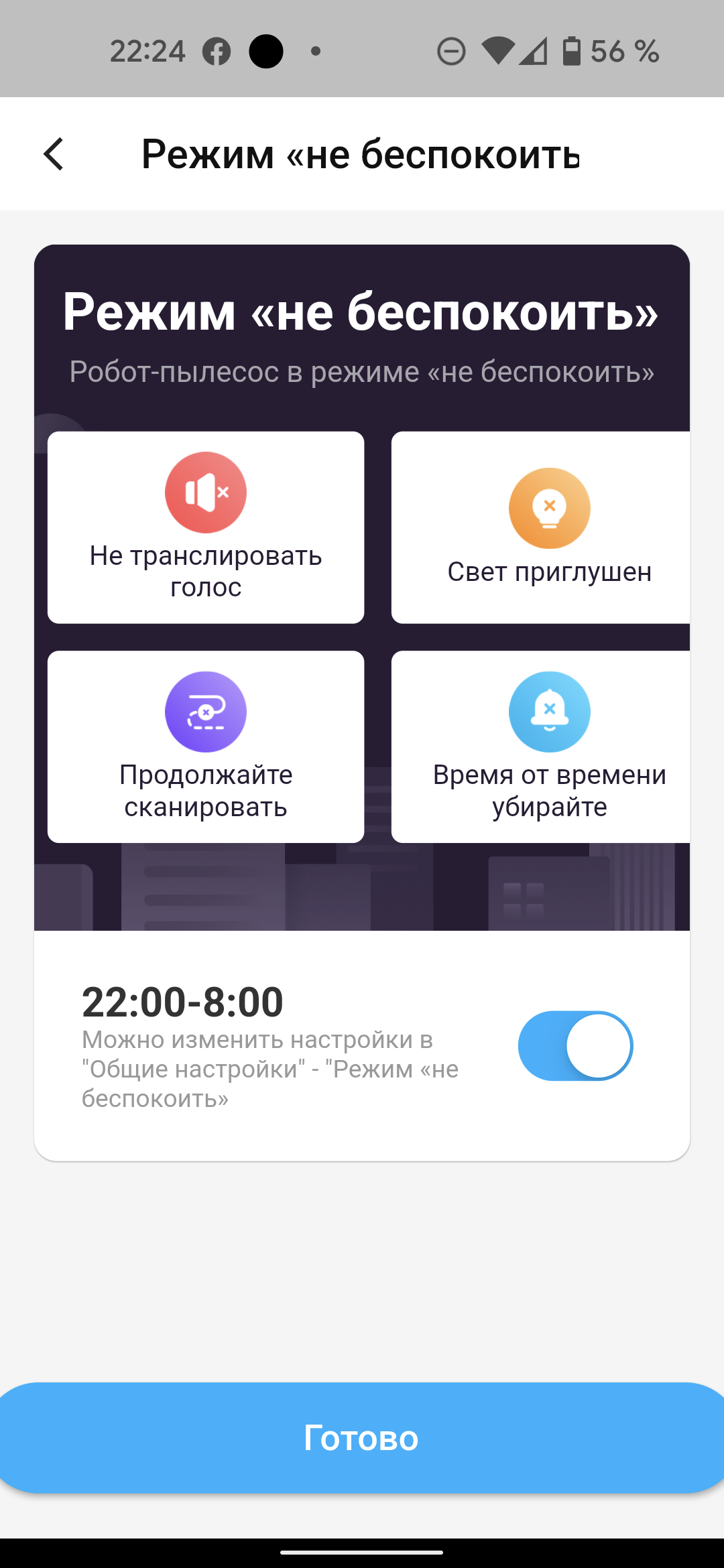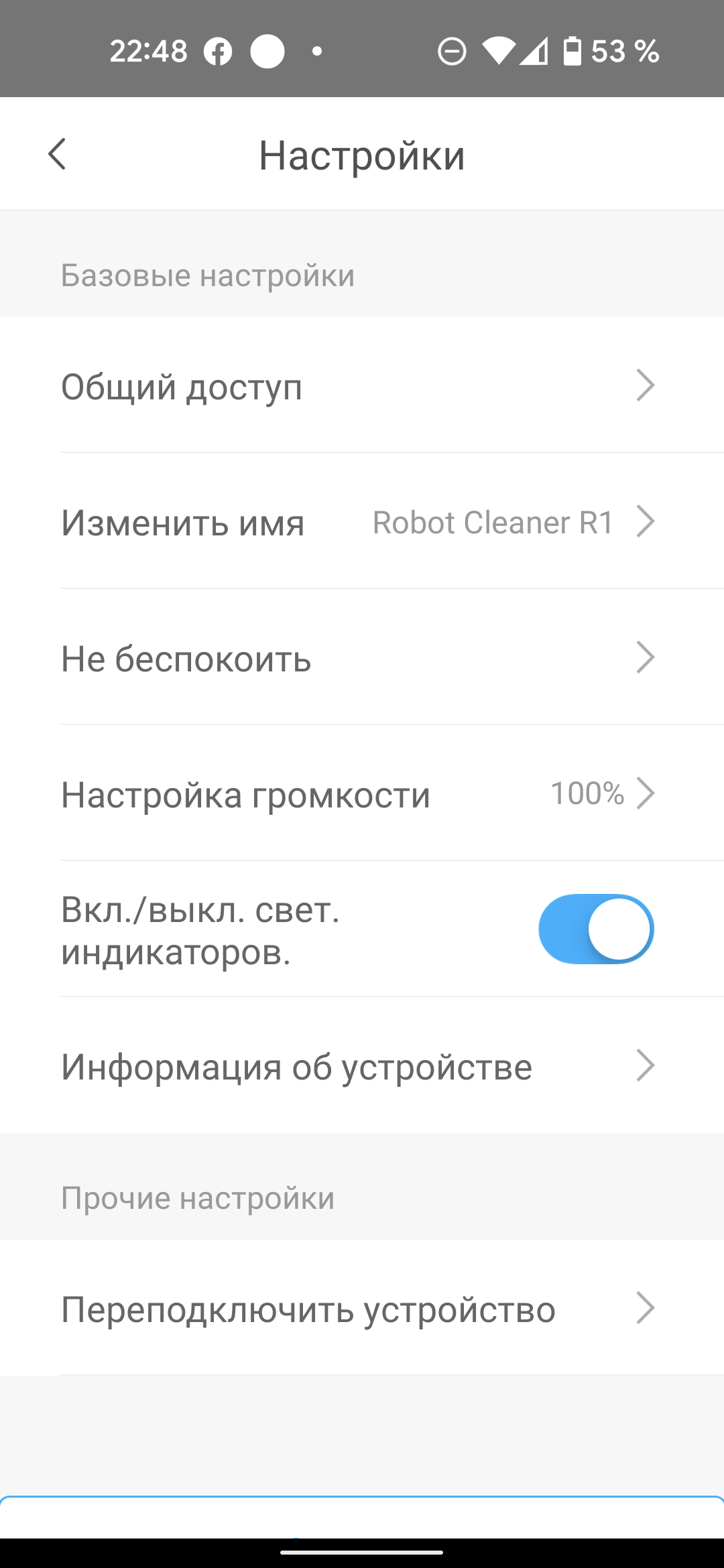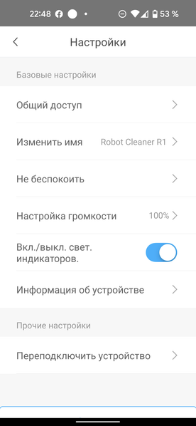Помимо кнопок, запускающих и останавливающих уборку, на этой странице мы можем вернуть прибор на базу, а воспользовавшись кнопкой «Еще» — настроить уборку по расписанию, ознакомиться с историей уборок (доступна информация о времени и продолжительности последних запусков), проверить обновление прошивки, попросить устройство подать голос, если оно затерялось в недрах квартиры, и перейти на страницу настроек...