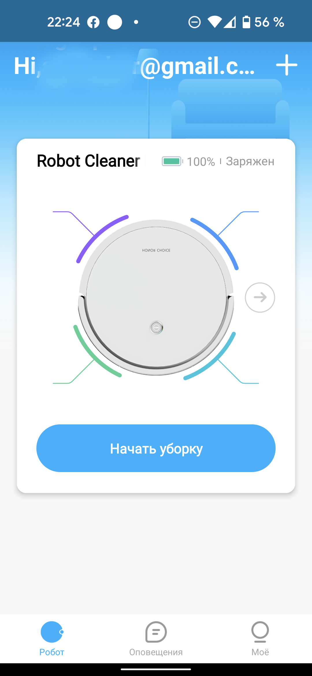 Первая страница приложения весьма лаконична: тут только изображение пылесоса с цветными индикаторами ресурса фильтров и кнопка «Начать уборку». Присмотревшись, мы замечаем серую стрелку справа от картинки и нажимаем на нее.