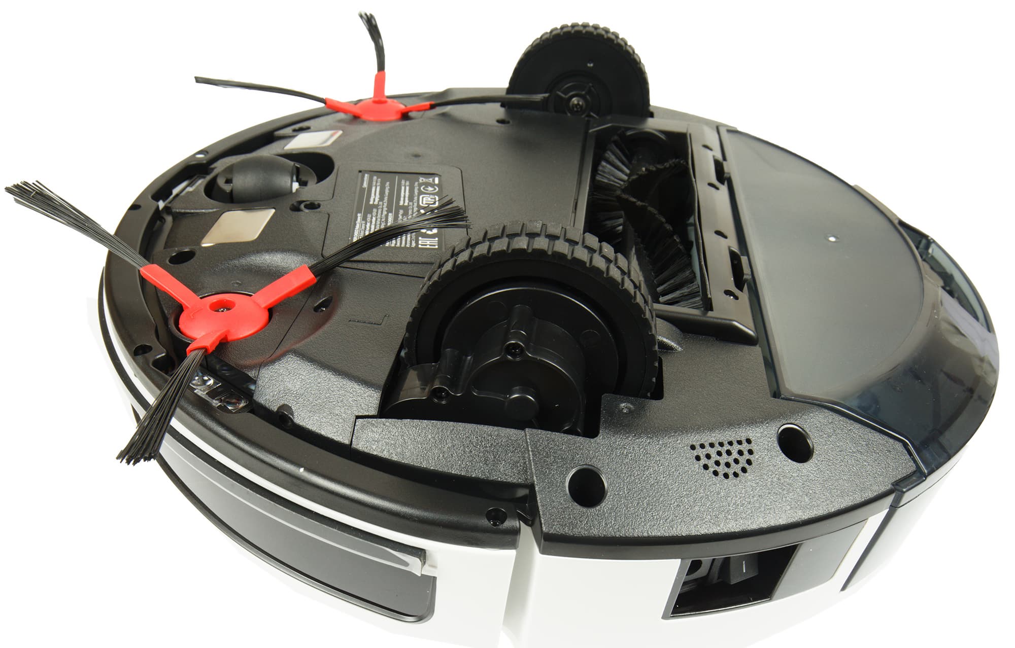 Направляющее колесо расположено в передней части нижней панели. Оно смонтировано в пластиковой сфере и способно вращаться на 360°. С боков от колеса — два контакта, с помощью которых устройство заряжается на базе.