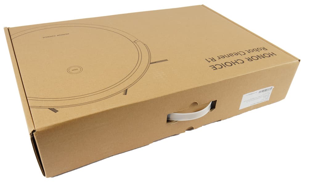 Робот-пылесос Honor Choice Robot Cleaner R1 упакован в светло-коричневую картонную коробку с лаконичным оформлением. На ее передней стороне — только векторное изображение устройства и названия производителя и модели.