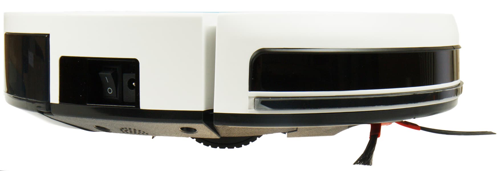 В боковой нише с левой стороны расположены тумблер включения и разъем для адаптера питания: Robot Cleaner R1 может заряжать аккумуляторы как на базе, так и с помощью проводного подключения.
