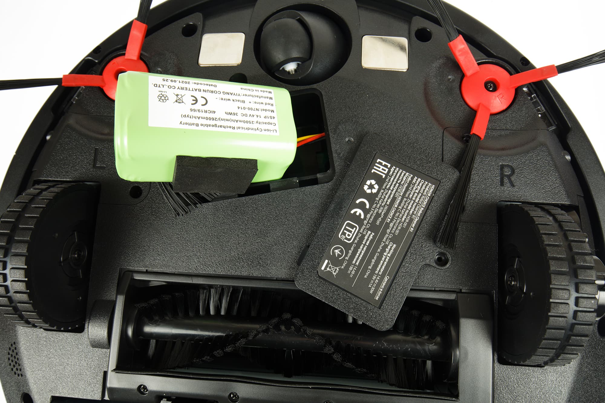 За передним колесом находится крышка аккумуляторного отсека, закрепленная винтом с крестообразной головкой. Батарея пылесоса съемная и легко заменяется при необходимости. Аккумуляторная сборка состоит из четырех стандартных элементов 18650 — они упакованы в термоусадку и снабжены резиновым уплотнителем, исключающим вибрацию и посторонние звуки при работе.