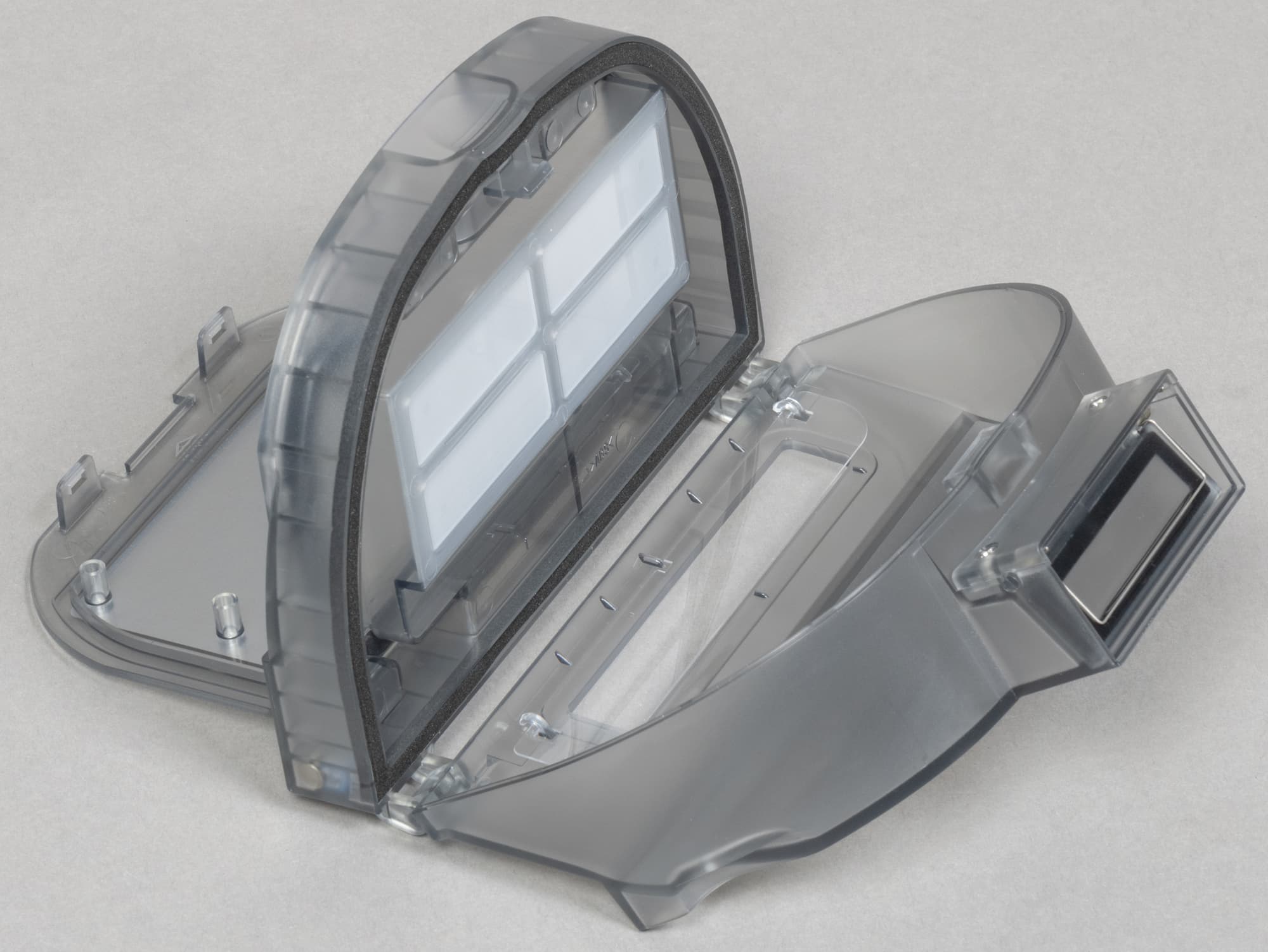 Система фильтрации у этой модели двуступенчатая: поток воздуха с пылью проходит через тонкую капроновую сетку, защищающую от повреждений основной элемент: прямоугольный HEPA-фильтр.