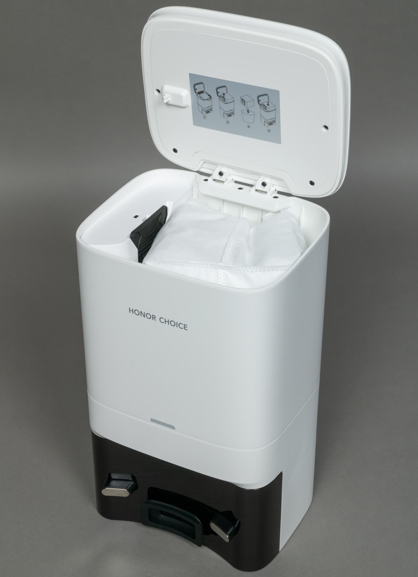 Поток воздуха с пылью и мусором покидает контейнер и направляется в одноразовый пакет, установленный в отсеке станции. Посадочное место под него оборудовано специальным датчиком, и без мешка функция самоочистки не включится.