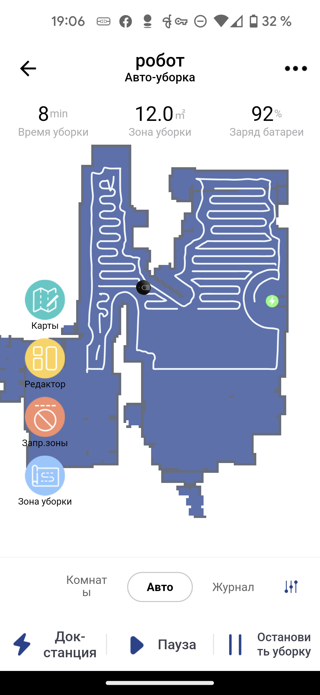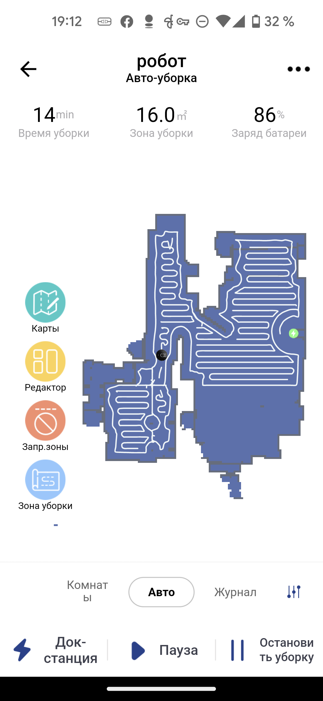 В центре главного экрана мы видим карту помещения, как его представляет себе робот. Для ее создания необходимо провести как минимум одну полную уборку всей квартиры (мы рассмотрим подробнее этот процесс в главе про эксплуатацию). Верх страницы отведен для данных о продолжительности текущей уборки, подметенной площади и актуального заряда аккумулятора в процентах. Кнопки в нижней части позволяют отправить пылесос на базу, приостановить или возобновить, а также прервать уборку.
