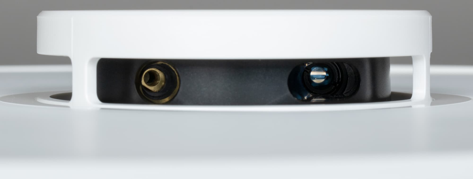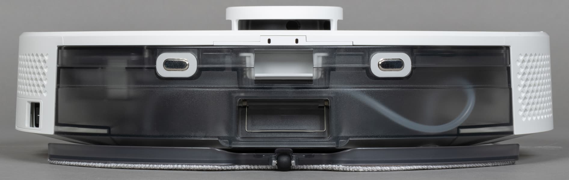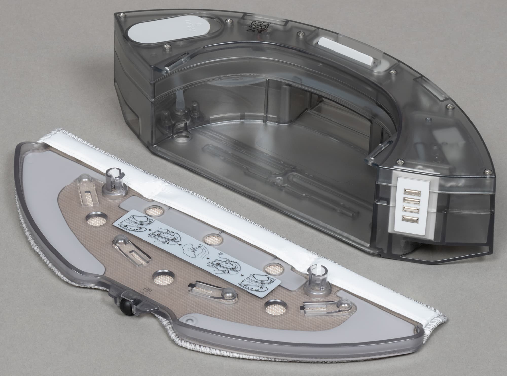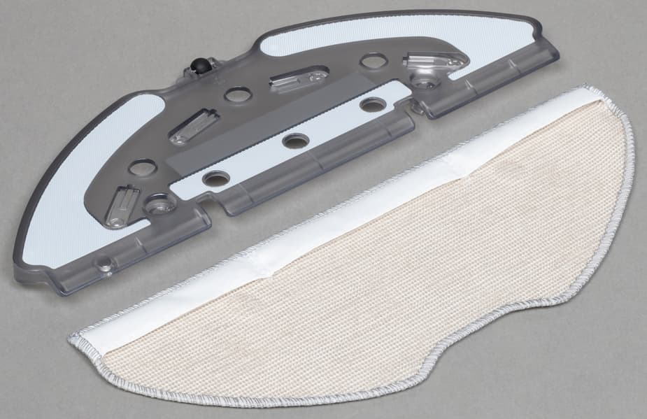 Внутри отсека для контейнера находятся четыре контактные пластины, соединяющие модуль с основным корпусом. Через две из них осуществляется зарядка устройства на базе, а вторая пара предназначена для питания миниатюрного насоса, подающего воду на рабочую поверхность во время влажной уборки.