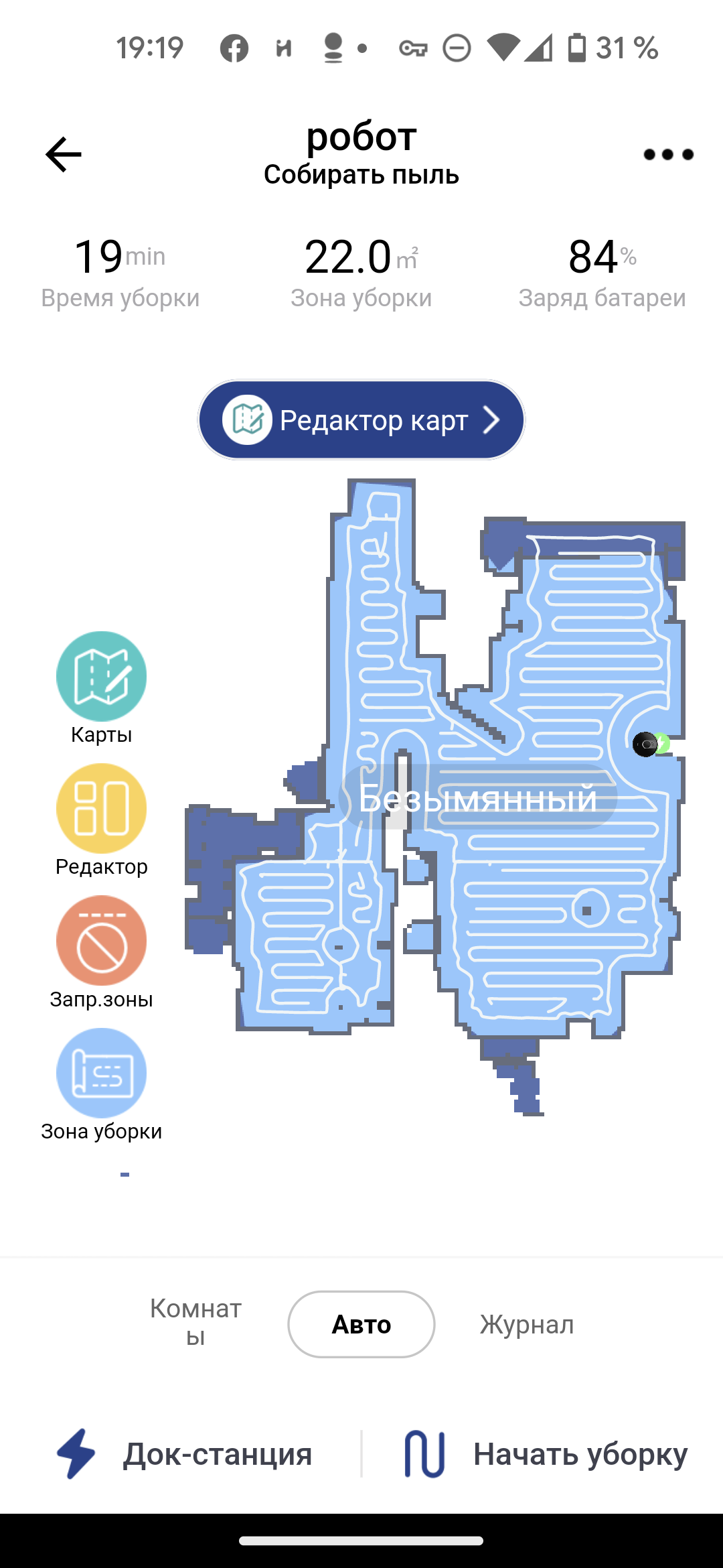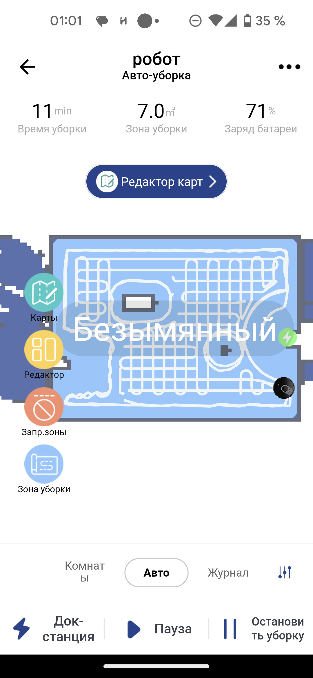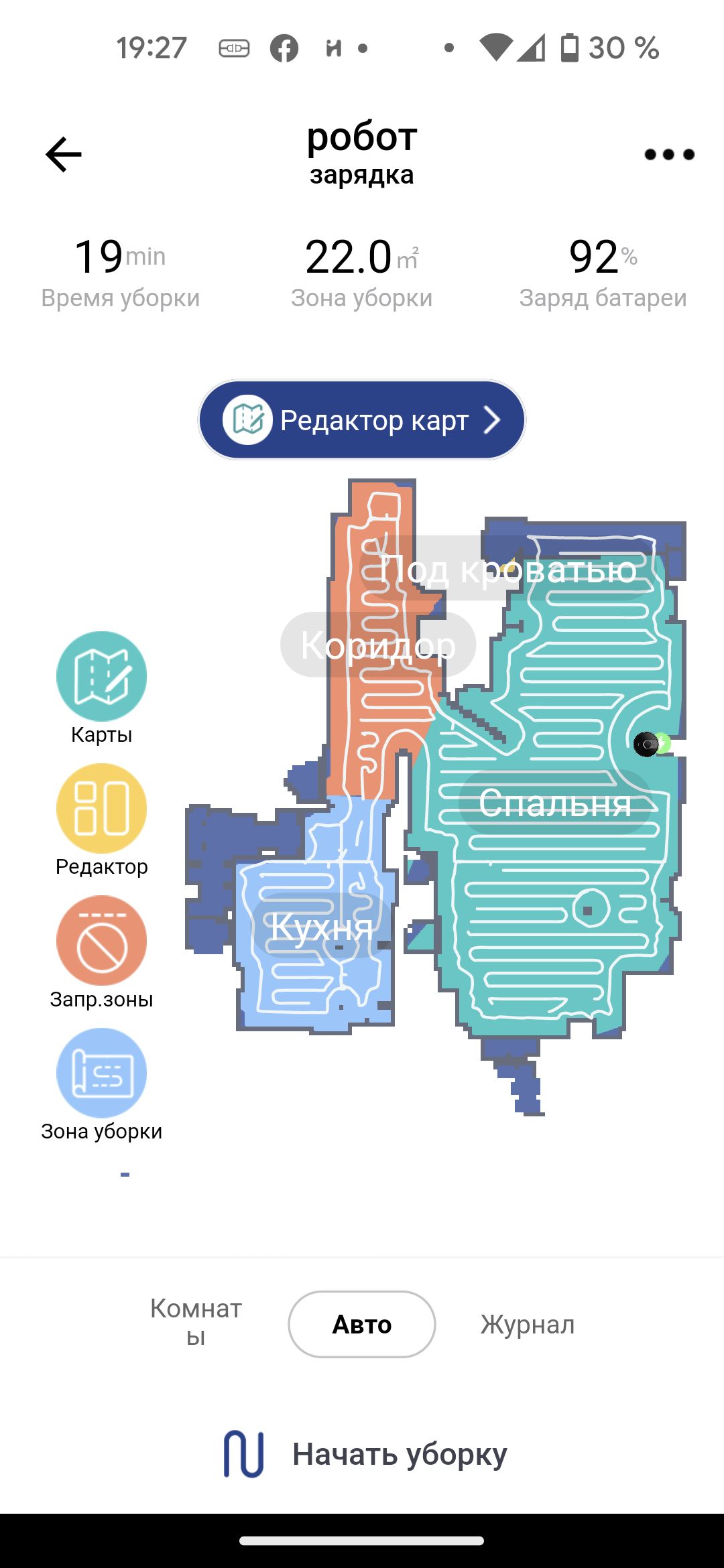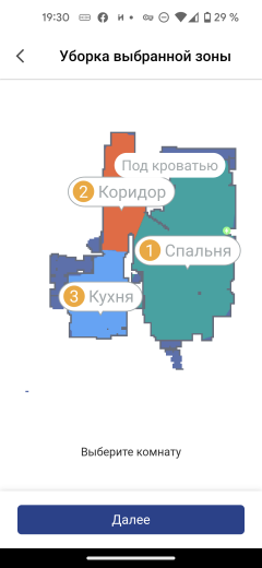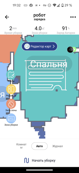 После первой уборки в автоматическом режиме на экране появляется карта помещения. Приложение само разбивает его на комнаты, раскрашивая их в разные цвета. Если такая разметка оказалась неточной, это можно исправить с помощью инструмента «редактор»