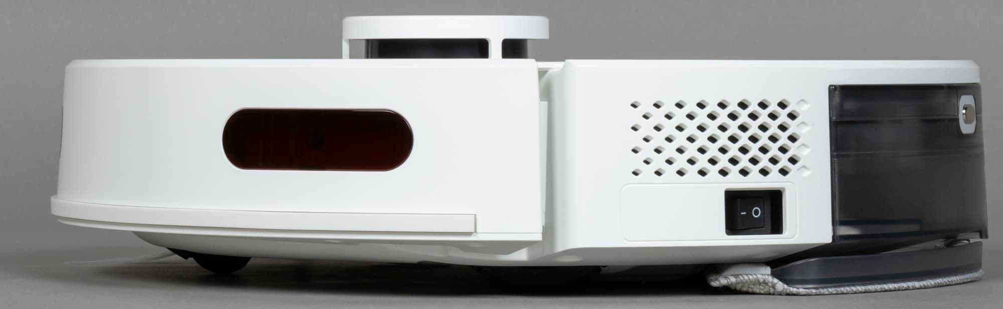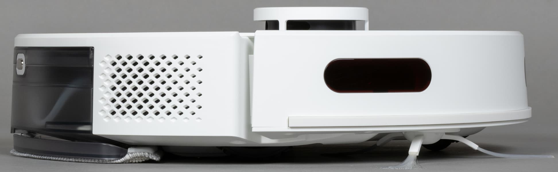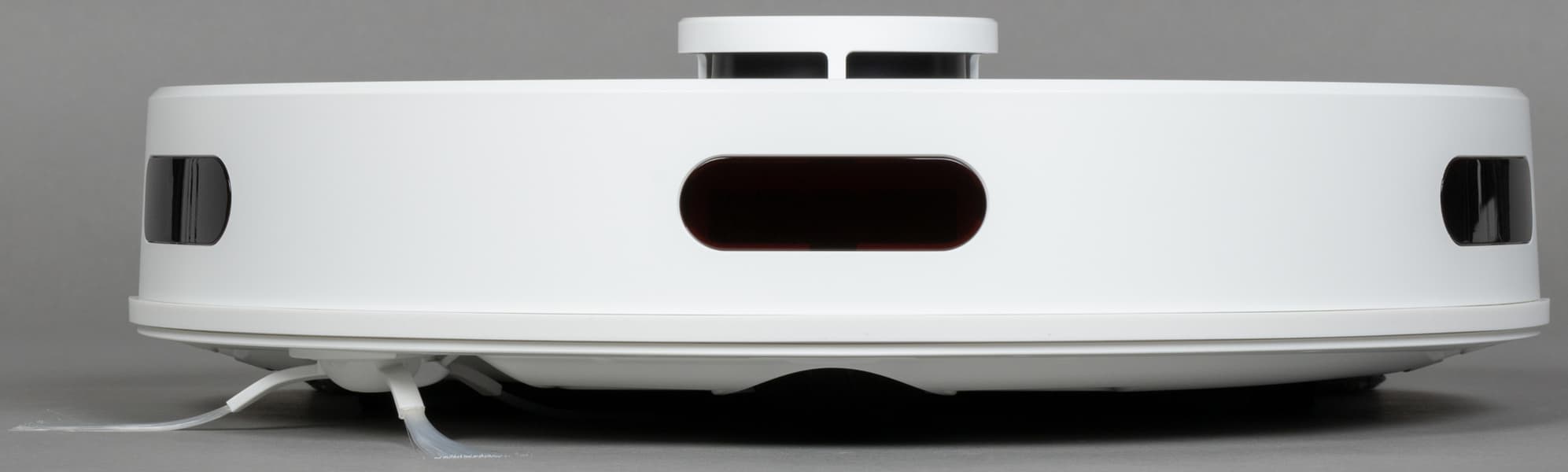 Над гладкой верхней панелью возвышается башенка лидара: в ней вращается основной навигационный орган пылесоса, состоящий из оптического излучателя и приемника. С помощью LDS-сенсора пылесос с высокой точностью определяет расстояние до препятствий и моментально строит карту помещения, планируя уборку.