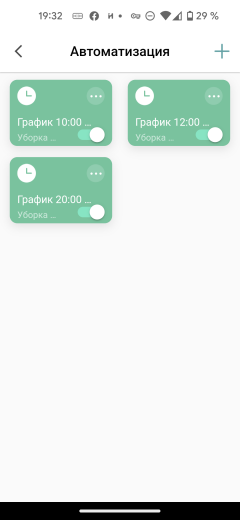 Планировщик уборок по расписанию называется в приложении «Автоматизация» или «График». Здесь можно настроить несколько запусков в заданное время нужного дня недели, указав для каждой задачи мощность всасывания и количество проходов по помещению. При желании можно выбрать для уборки одну или несколько комнат.