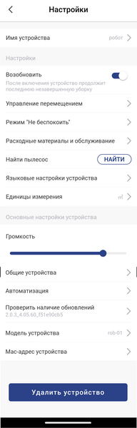 Пункт «Расходные материалы и обслуживание» предлагает узнать о ресурсе HEPA-фильтра и щеток — боковых и центральной. При замене расходников нужно обнулить сервисный интервал в приложении.