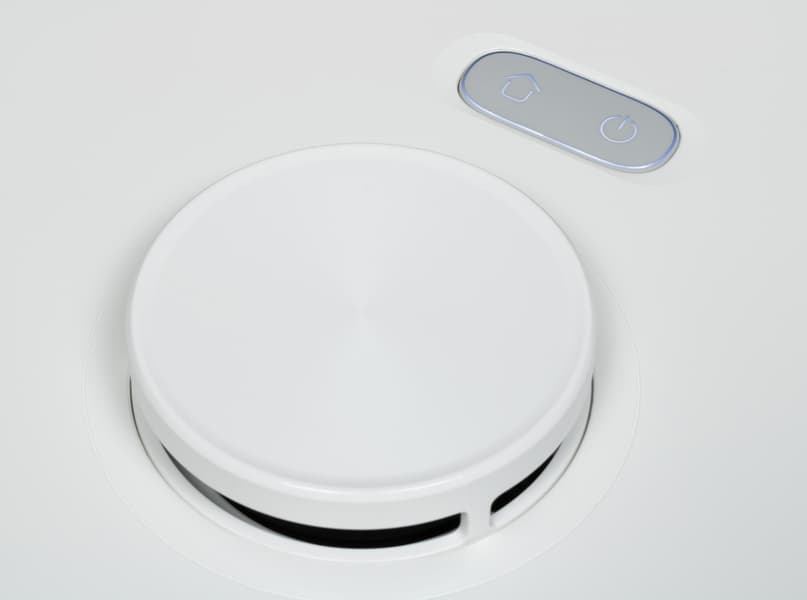 Базовая станция представляет собой параллелепипед со скругленными углами. На ее лицевой стороне есть контакты, обеспечивающие зарядку робота. Обрезиненный раструб между ними предназначен для удаления пыли и мусора из контейнера пылесоса. Светодиодный индикатор над посадочным местом сигнализирует о работе устройства: при зарядке аккумулятора он медленно мигает, а по окончании цикла зажигается ровным светом.