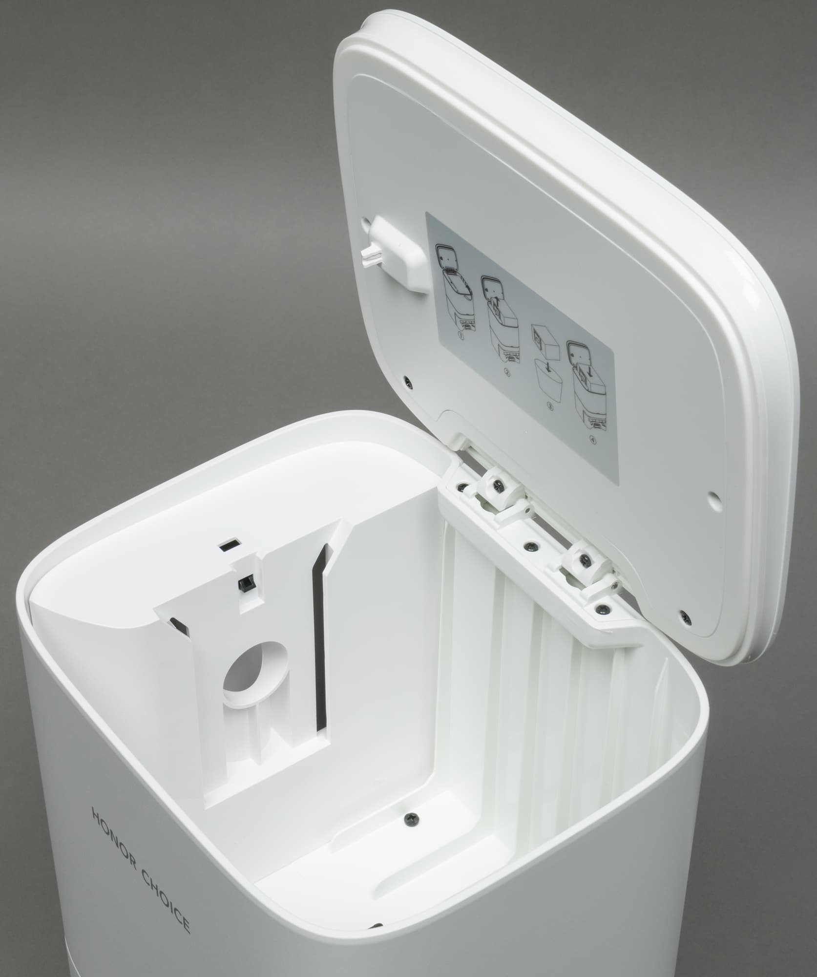 На крышке мусоросборника наклеена этикетка, объясняющая, как правильно опустошать емкость.