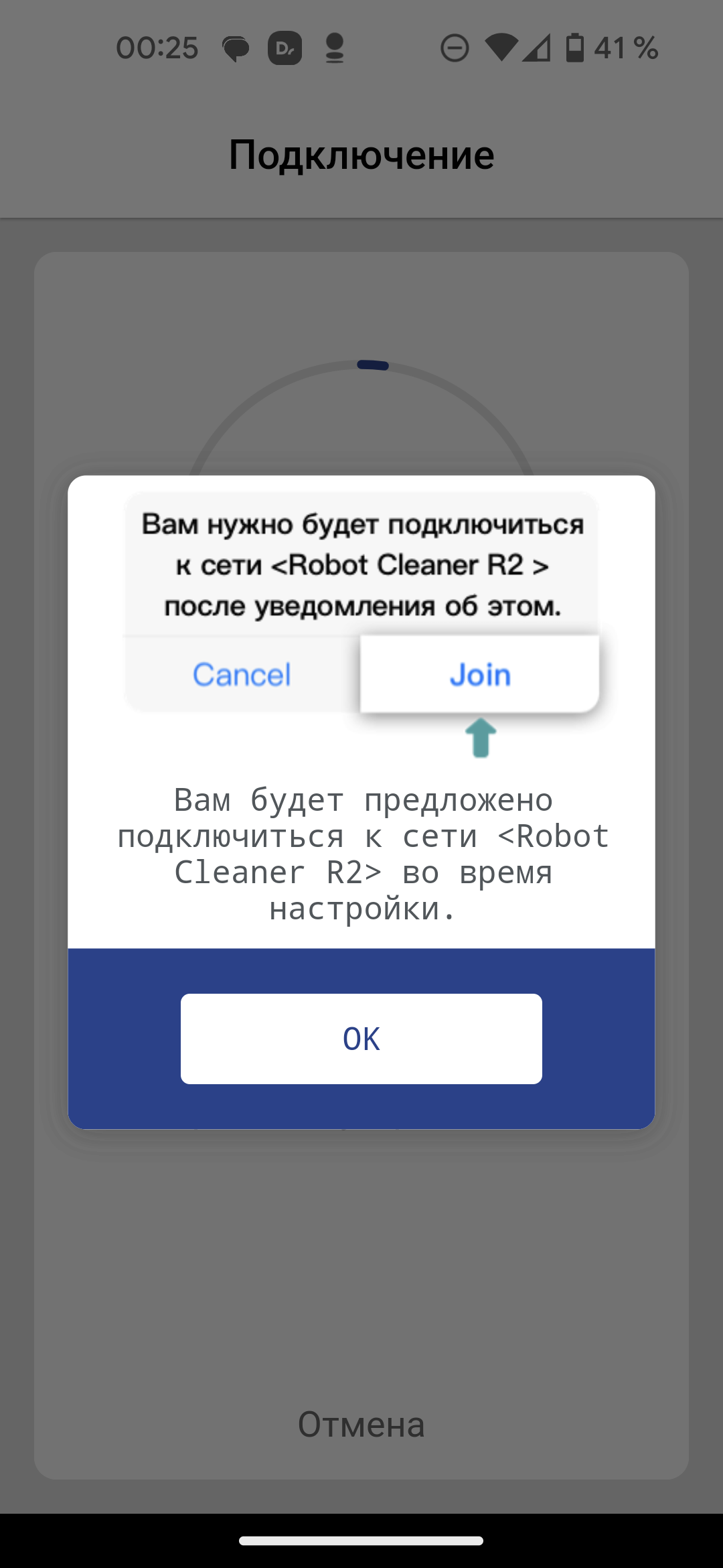 После ввода данных приложение подключается к временной сети, созданной нашим пылесосом, и через непродолжительное время сообщает об успешном завершении сопряжения.
