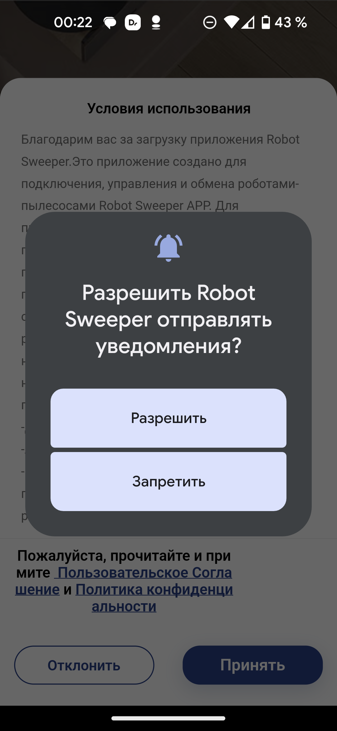 Для работы приложение запрашивает доступ к отправке уведомлений, требует принять пользовательское соглашение и политику конфиденциальности и зарегистрироваться с верифицированным адресом электронной почты.