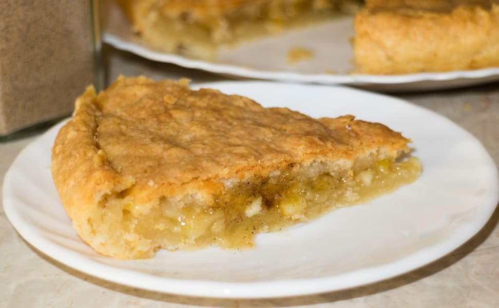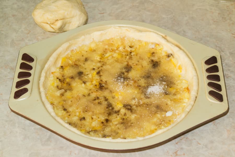 Большую часть раскатали и уложили на дно и бортики металлической формы. Затем измельчили лимон, предварительно разрезав его и удалив косточки. Выложили лимон на тесто, сверху посыпали сахаром и, подумав, молотым кардамоном. Остаток теста раскатали и накрыли им пирог, хорошо защипав края.
