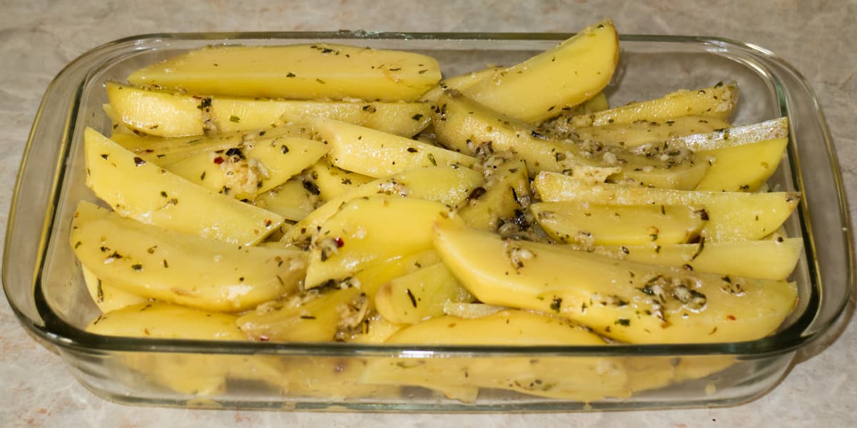 Картофель был очищен, нарезан на крупные ломти и залит кипятком на пять минут. После того, как слили воду, сбрызнули картофель маслом, посолили, добавили смесь специй и довольно много давленого свежего чеснока. Перемешали и выложили в стеклянную форму. Всего в нее поместилось 800 г подготовленного картофеля.