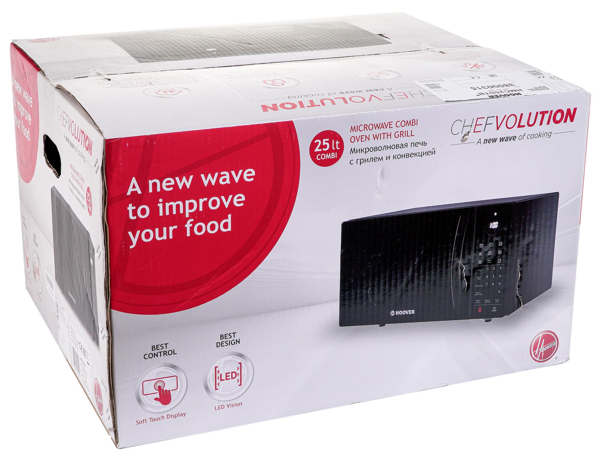 Микроволновая печь Hoover Chefvolution HMC25STB поставляется в коробке, изготовленной из плотного окрашенного картона. На светлом фоне представлены фотографии печи и некоторое количество графической и текстовой информации, которая знакомит с особенностями прибора. Коробка весьма тяжела и объемна. В боковых сторонах предусмотрено два углубления для ладоней, что значительно облегчает переноску прибора.
