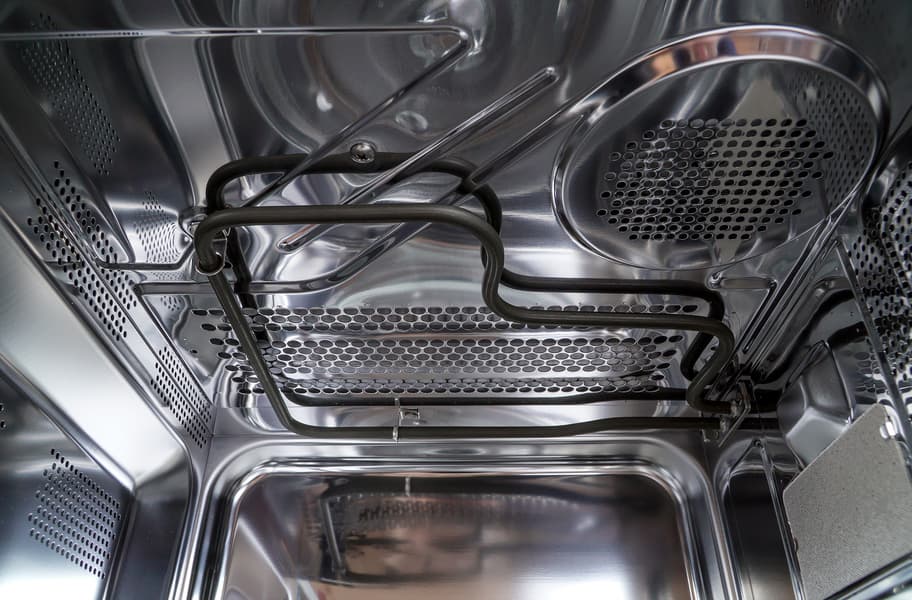 Магнетрон находится по центру правой стенки камеры. Ближе к дверце находится лампа для подсветки внутренней камеры во время работы или в открытом состоянии. На потолке на одной линии с лампочкой расположен вентилятор. По центру мы видим открытый тэн, а под отверстиями — два элемента кварцевого гриля.