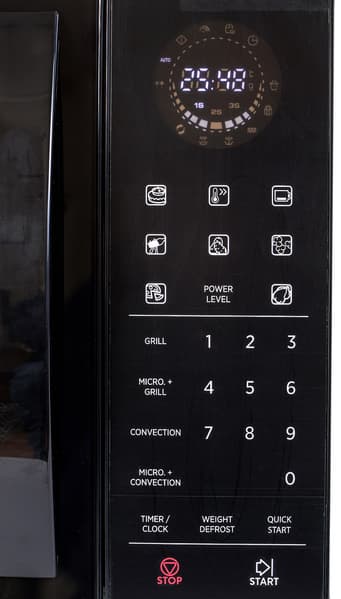 Панель управления находится в традиционном для СВЧ-печей месте — справа от дверцы. Дисплей расположен вверху, под ним — кнопки выбора автоматических программ и режимов, внизу можно увидеть две главные управляющие кнопки — «Stop» и «Start». Панель управления не перегружена и оформлена подчеркнуто строго и просто, что делает целостным общий стиль прибора.
