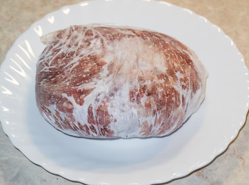 Печь оснащена функцией разморозки по весу. Продукт такого веса было предложено размораживать в течение 18 минут ровно. Через 6 минут мы открыли печь и осмотрели нашего подопытного: сверху кусок выглядел таким же замороженным. Но с другой стороны он стал более мягким. Перевернули и вернули тарелку в микроволновку.