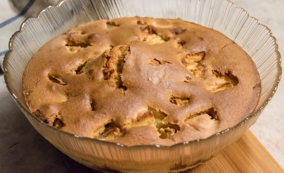 Минут через 10 мы почувствовали приятный запах бисквита с яблоками. Спустя 15 минут открыли печь и заглянули — шарлотка зримо увеличилась в объеме, сверху тесто начало подрумяниваться, однако деревянная шпажка оказалась влажной от теста. Второй раз открыли печь на 22-й минуте. Корочка стала еще румянее, внутри тесто вроде бы пропеклось, но нам показалось, что бисквит не «схватился» до конца. Решили оставить пирог еще на 5 минут.
