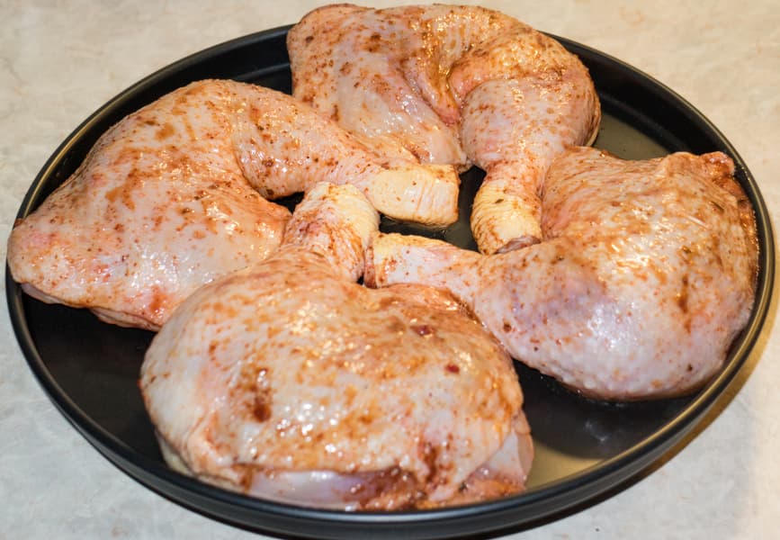 Уложили куриные части на комплектную форму, сомневаясь, что ее получится использовать в комбинированном режиме. Поэтому первые минуты работы стояли рядом с печью и внимательно прислушивались — не раздастся ли звук искрящего металла. Задали продолжительность жарки в 45 минут.