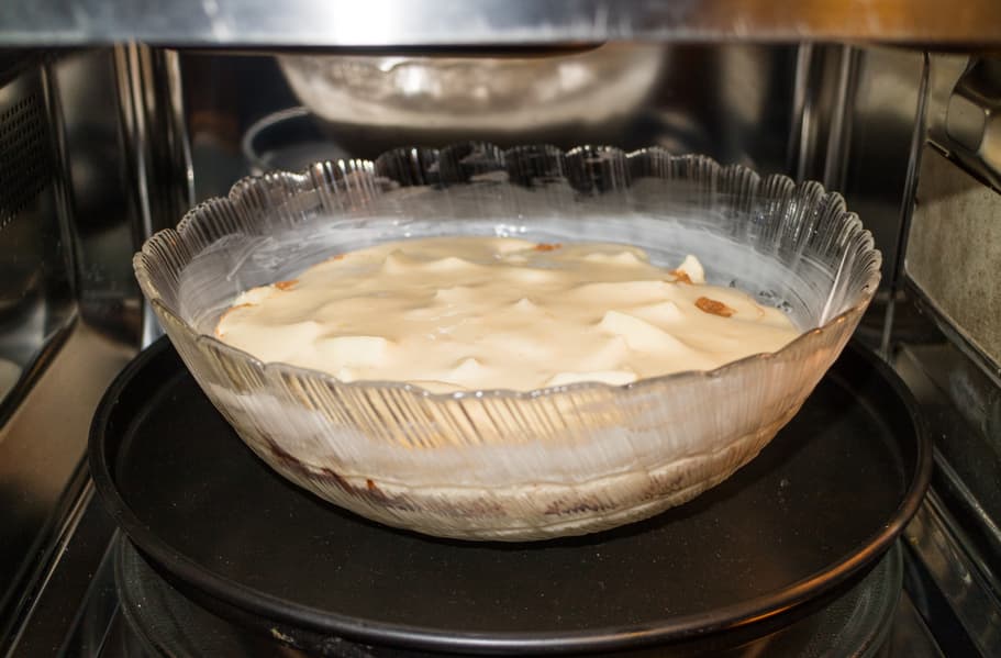 Подходящую стеклянную миску обильно смазали сливочным маслом и вылили в нее часть теста, поверх которого выложили яблоки. Покрыли кусочки яблок оставшимся тестом. Изначально задали следующие параметры: режим — «Микроволны+конвекция», температура — 200 °C, продолжительность — 30 минут.