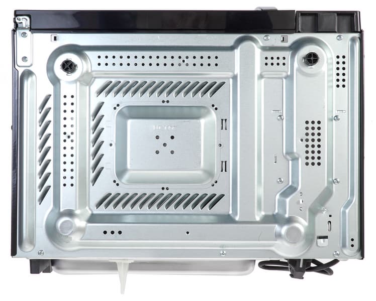 Сложная форма дна служит, вероятно, для эффективного охлаждения и отвода нагретого воздуха. В нижней панели имеется большое количество вентиляционных отверстий разной формы и направленности. Ближе к передней стороне на дне закреплены две пластиковые ножки, не оснащенные прорезиненными вставками. Несмотря на это, на поверхности стола печь стоит надежно, не скользит, если ее целенаправленно не двигать.