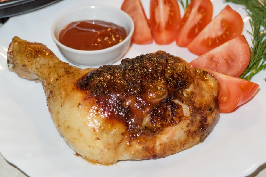 Печь гудела, вентилятор шумел. Через 20 минут, когда от печи пошел аппетитный запах жареной курицы, заглянули внутрь — поверхность окороков начала темнеть. Закрыли дверцу, возобновили программу. Второй раз открыли дверцу через 40 минут с начала процесса. Курица на вид была совершенно готова — шкурка равномерно поджарена, запах говорит о том, что блюдо пора извлекать.