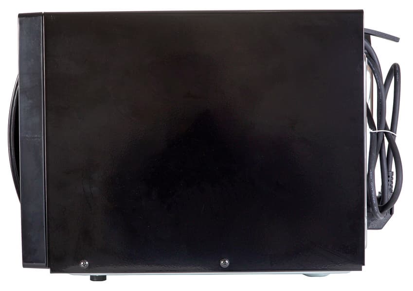 С задней стороны мы видим большую наклейку с технической информацией о приборе и предупреждением о запрете снятия панели. Ряд вентиляционных отверстий находятся напротив панели управления. Два ограничителя не позволят поставить печь вплотную к стене или мебели. Верхний ограничитель дополнительно защищает шнур электропитания от перегиба. Длина шнура — 1 м, что не так много. Пользователю, соответственно, нужно предусмотреть возможность установки печи рядом с розеткой.