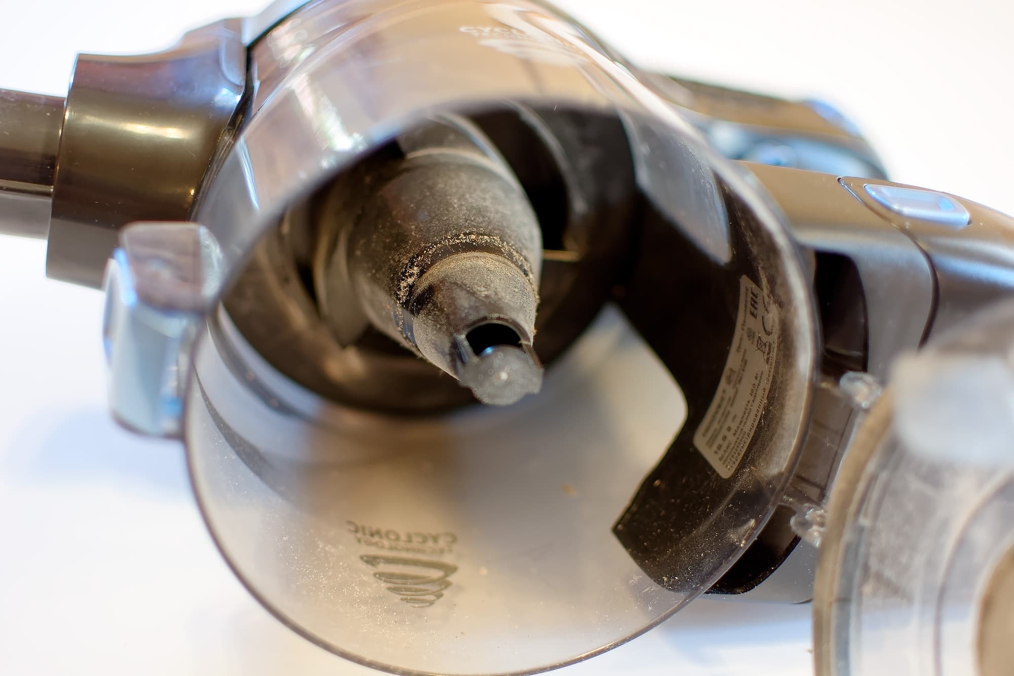 Прозрачный корпус пылесборника позволяет оценить степень его заполнения с первого взгляда, по крайней мере, пока он не сильно поцарапался изнутри. Производитель указывает, что его объем равен 0,8 л, но это, видимо, полный объем. Мы налили воды до отметки Max и, вылив, измерили ее объем — он был равен 540 мл. Дно пылесборника откидывается вниз, его можно опорожнить, даже не отсоединяя от пылесоса. Однако весь «кувшин» тоже можно отсоединить от корпуса, для этого его нужно чуть провернуть против часовой стрелки. Таким же способом отсоединяется от корпуса циклон с сетчатым фильтром, а потом сетчатый фильтр от циклона.