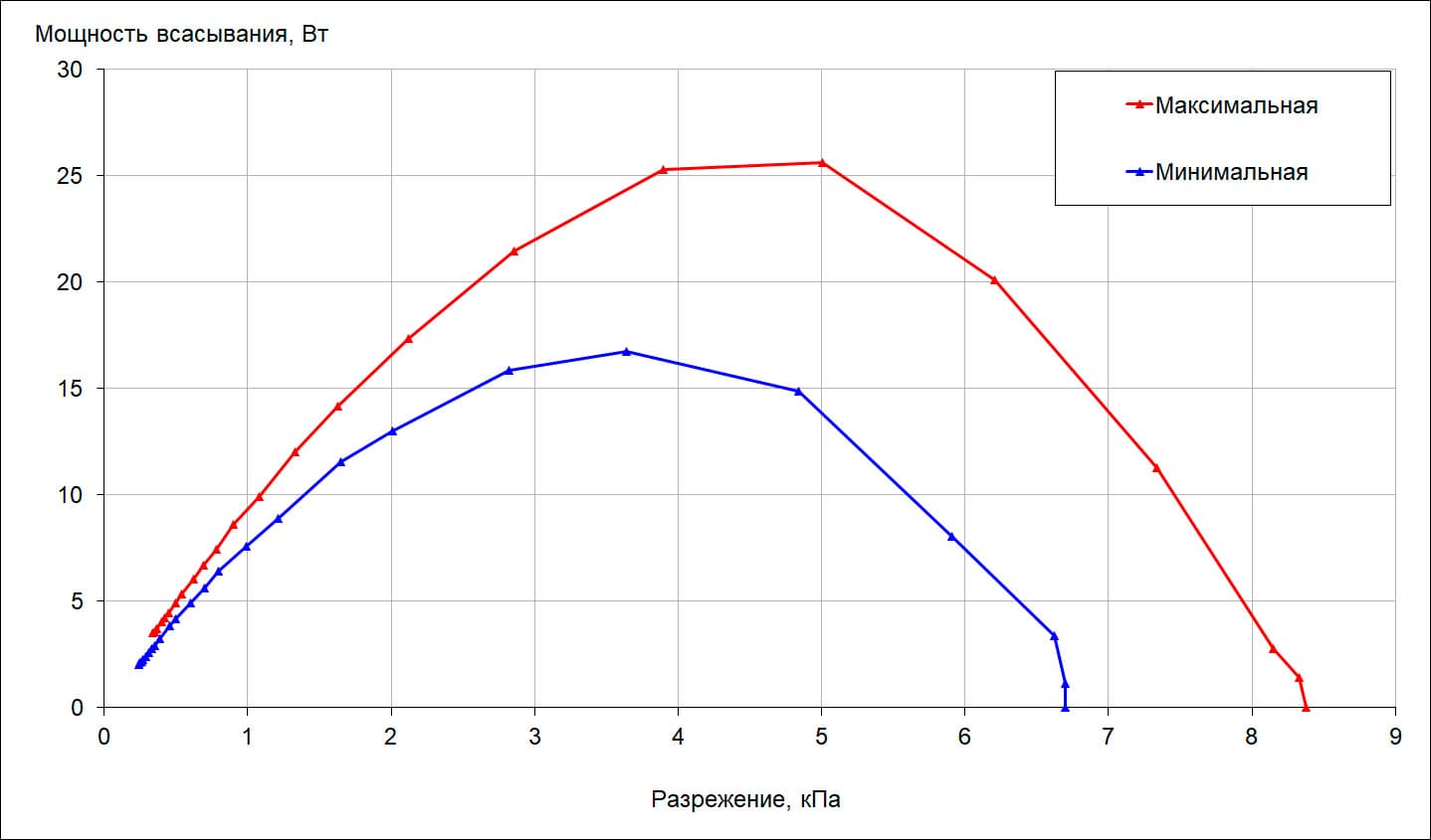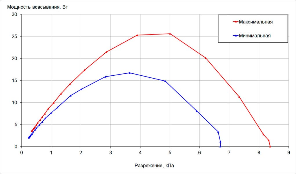 Мощность всасывания (что это такое и как мы ее измеряем, описано в отдельной статье) мы определяли при работе пылесоса без трубы и насадок. Зависимость мощности всасывания от создаваемого разрежения приведена на графике ниже: