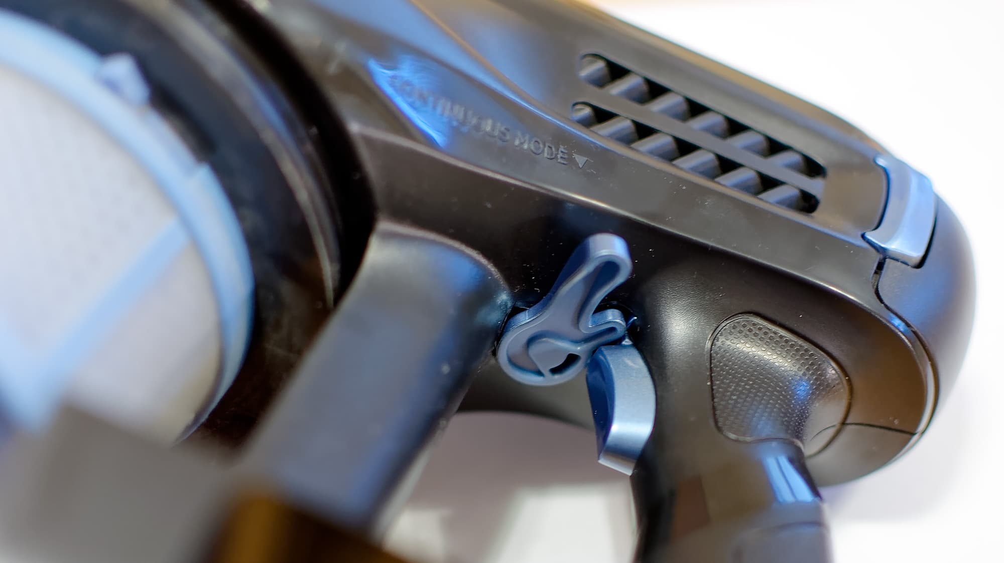 Корпус изготовлен из черного пластика, синим выделены интерактивные элементы — защелки, кнопки и т. п. Это удобно: сразу видишь, на что жать. В районе ручки присутствует насечка для лучшего удержания в руке, но это тот же твердый пластик — никакой резины, никакого софт-тач.
