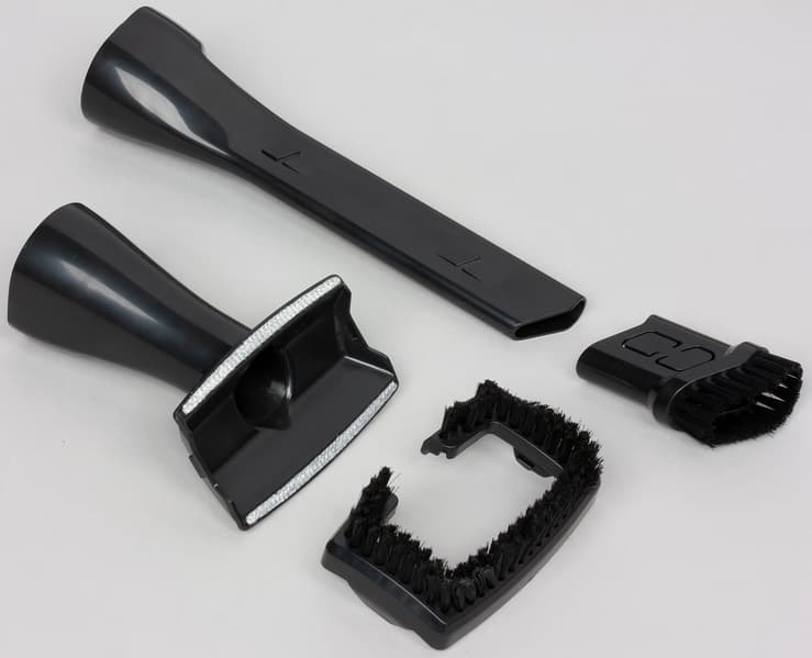 К пылесосу прилагается щелевая насадка традиционной конструкции (ее общая длина 230 мм, узкой части — 150 мм). На насадку можно надеть щеточку. Также прилагается щетка с щетиной средней жесткости (обычно такие называют «мебельными»), щетину с которой тоже можно снять.