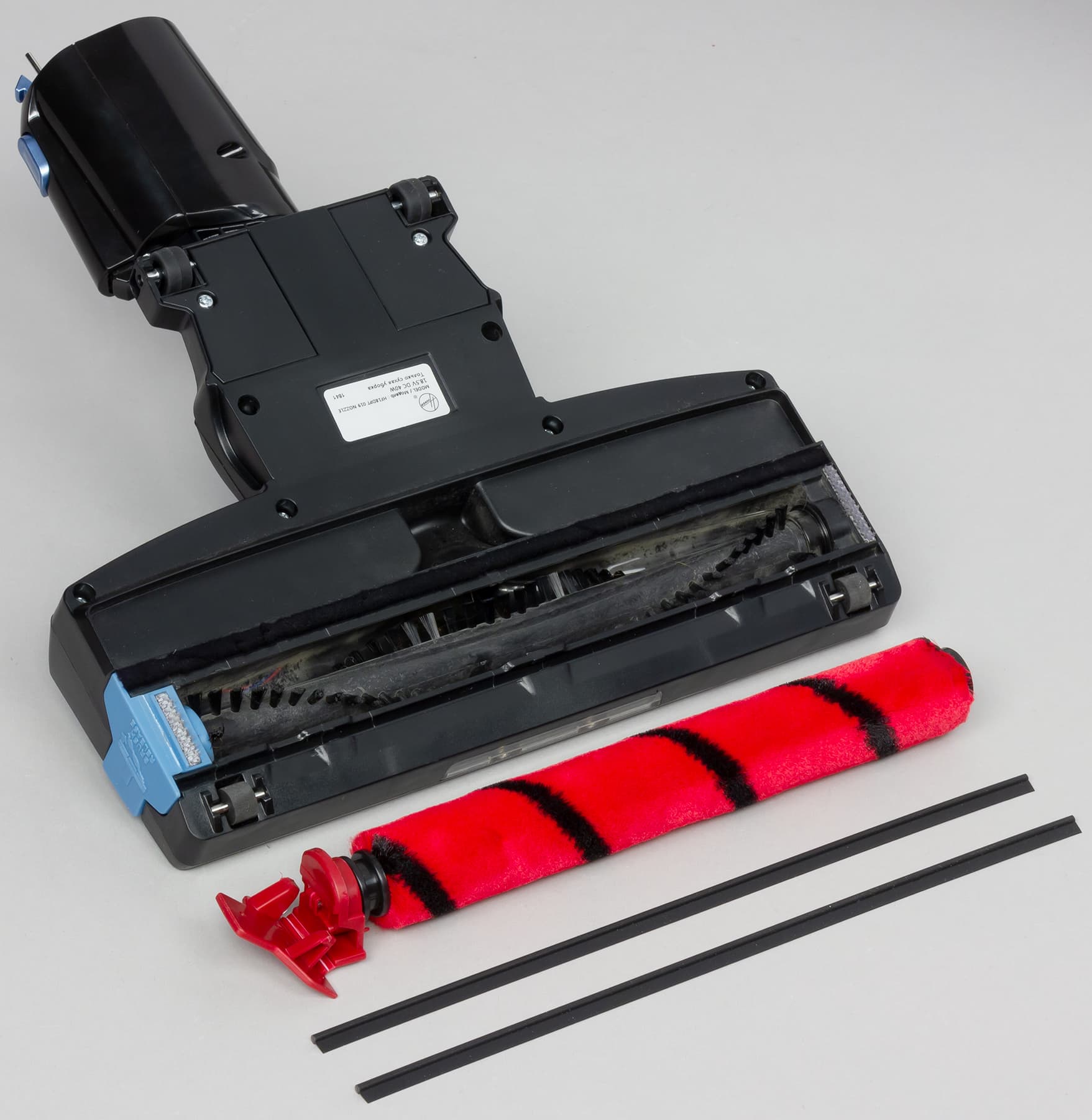 Ширина всей электрощетки 250 мм, вращающейся щетки — 215 мм. Скользить по полу ей помогают четыре жестких пластиковых ролика. Снизу на корпусе щетки спереди есть три выреза для захвата мусора потоком воздуха непосредственно от стен и предметов обстановки. Питание для электромотора и подсветки передается от основного блока по проводникам в трубке, но при необходимости электрощетку можно закрепить непосредственно на основном блоке.