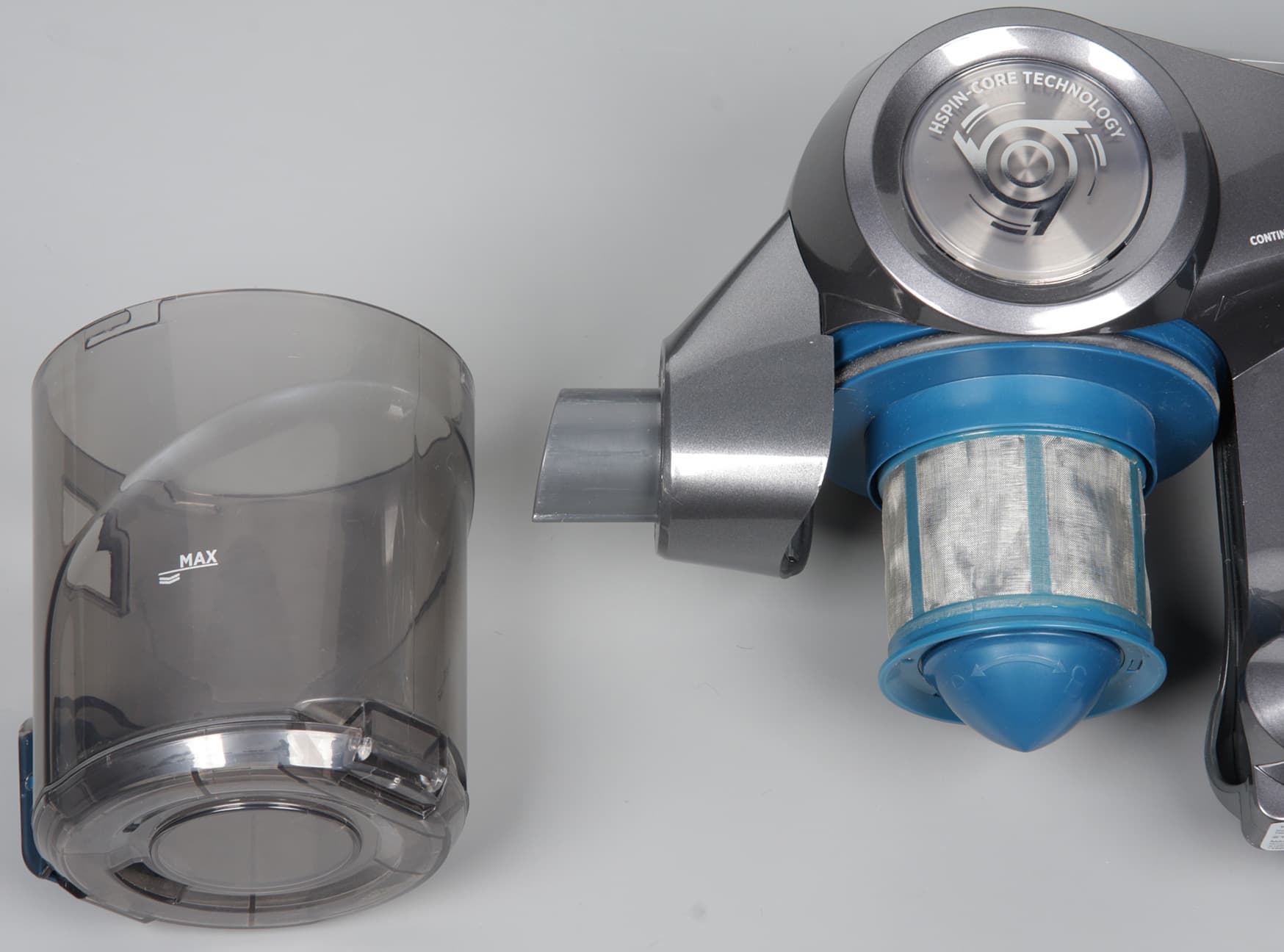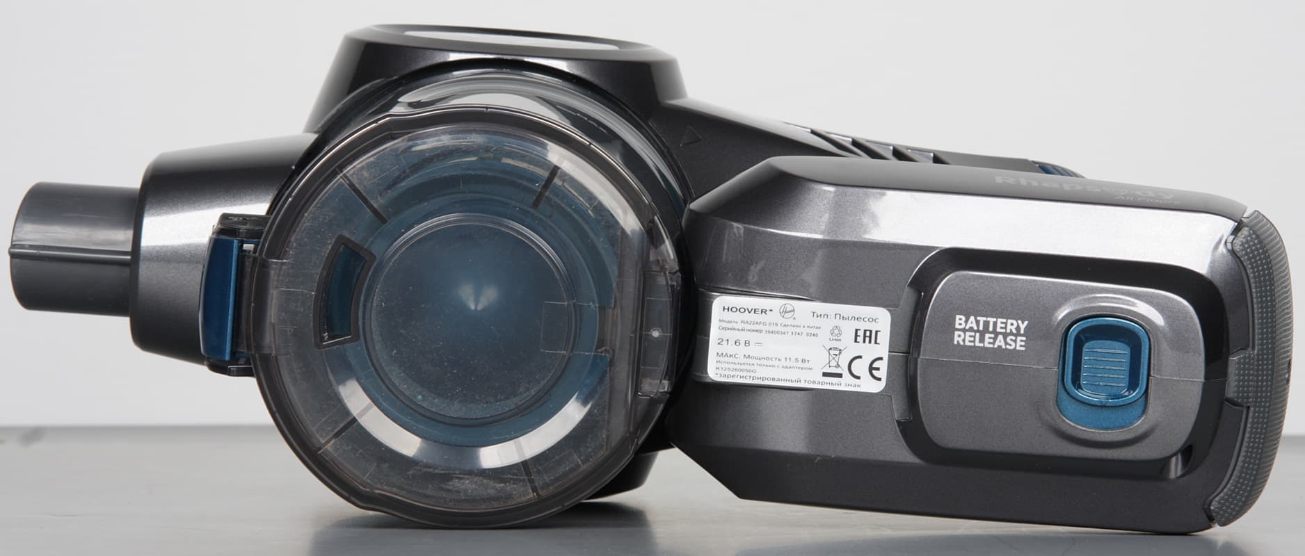 Прозрачный слегка тонированный корпус пылесборника позволяет оценить степень его заполнения с первого взгляда, по крайней мере, пока он несильно поцарапался изнутри. При нажатии на фиксатор дно пылесборника откидывается вниз.