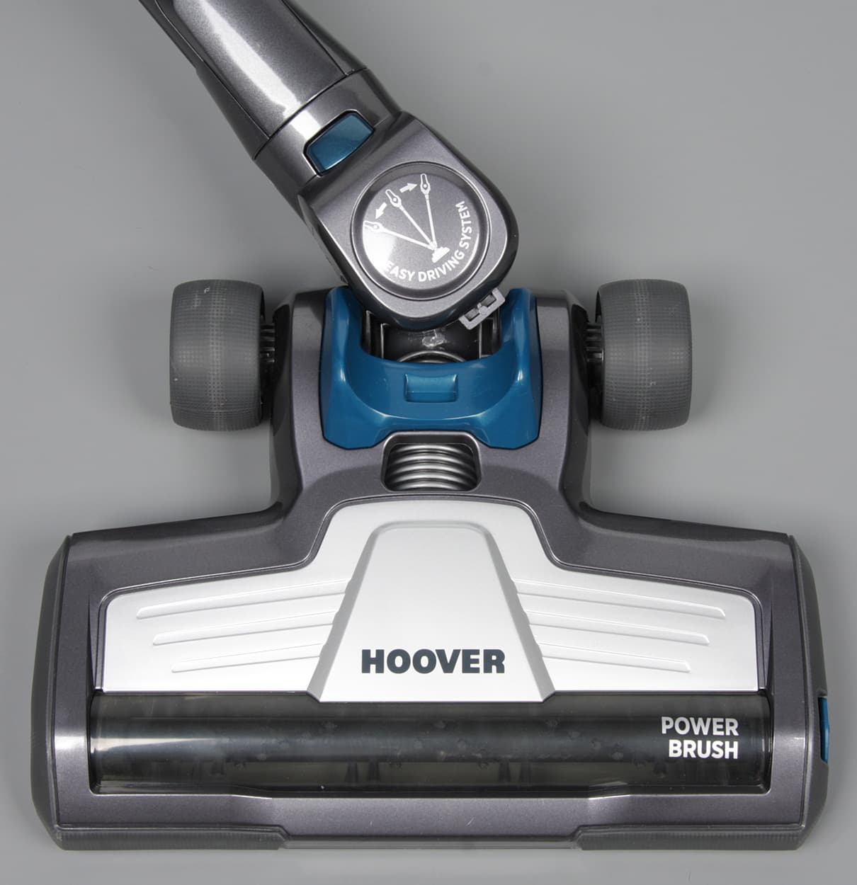Подшипник в торце щетки — это, скорее всего, подшипник скольжения, но достоверно выяснить это не удалось, так как с приложением разумных усилий узел подшипника не разбирается. Перед отсеком щетки и за ним есть два подвижно закрепленных скребка из упругого пластика. В переднем есть окна для захвата крупного мусора. Скользить насадке по полу помогают два небольших ролика из жесткого пластика спереди и два колесика с покрышками из упругого пластика сзади под шарниром. Справа и слева спереди с заходом на бока есть накладки из упругого пластика, предохраняющие мебель от последствий ударов насадкой. Спереди по центру за прозрачным окошком расположены три светодиода белого свечения. При уборке в темных закоулках они помогают рассмотреть, что находится перед насадкой. Питание для электромотора щетки и подсветки передается от основного блока по проводникам в трубе, но при необходимости электрощетку можно закрепить непосредственно на основном блоке. Ширина всей насадки — 252 мм.