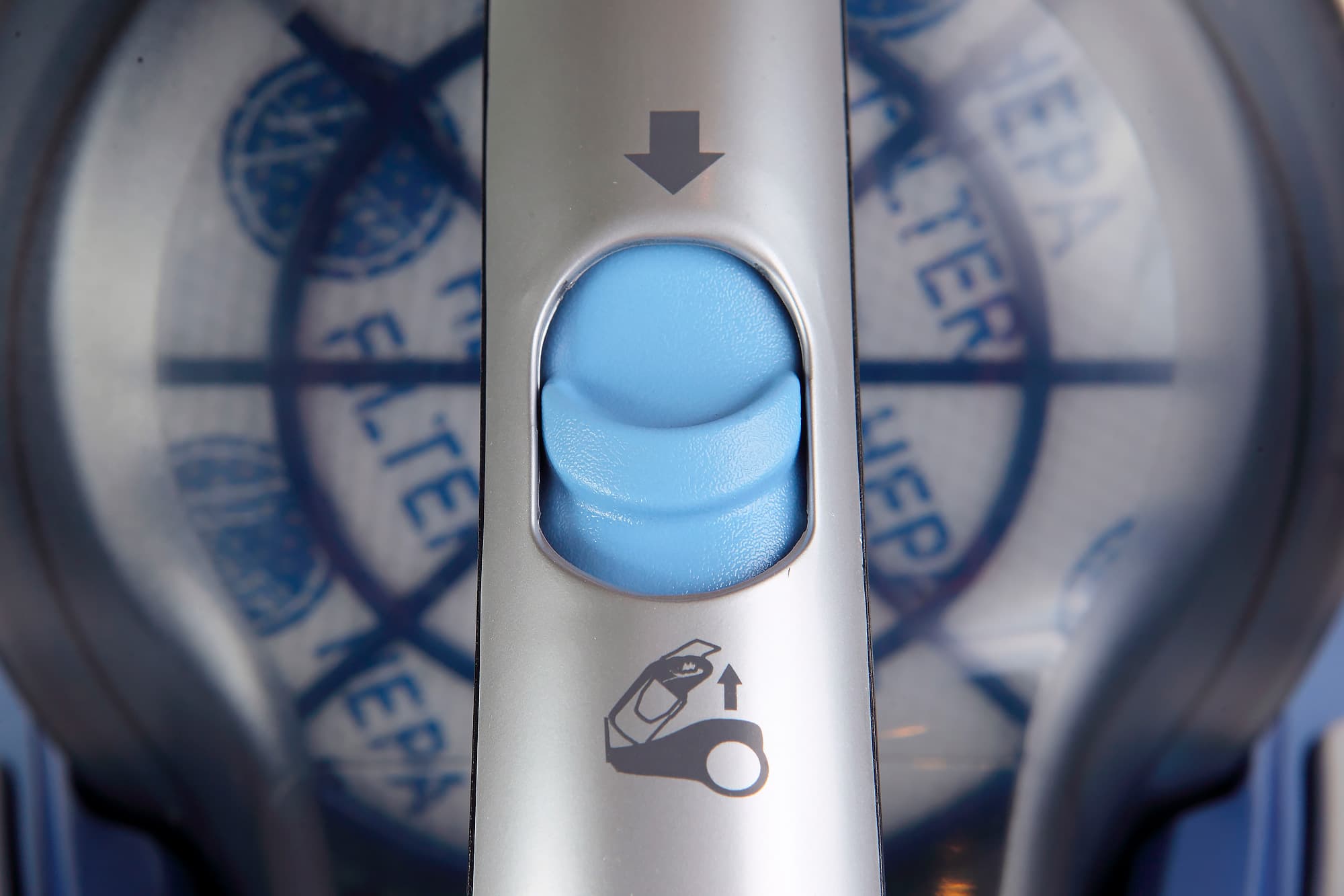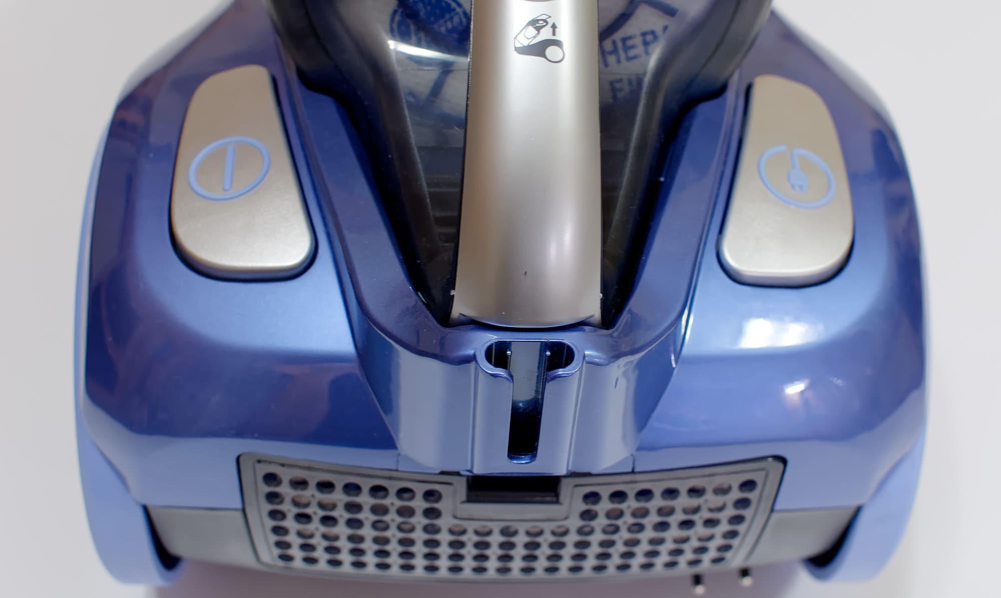 Для переноски используется ручка мусорного контейнера (на фото выше она хорошо видна). На ней же, сверху, находится кнопка отсоединения контейнера от пылесоса. Нам это показалось немного страшноватым, т. к. взяв пылесос для переноски за ручку и случайно сдвинув кнопку, вы останетесь с контейнером в руках и пылесосом, упавшим на ногу. Однако во время тестирования мы убедились, что сделать это действительно случайно вряд ли удастся — хват за ручку для переноски пылесоса не подразумевает наличия на этом месте пальца, который сдвинет кнопку.