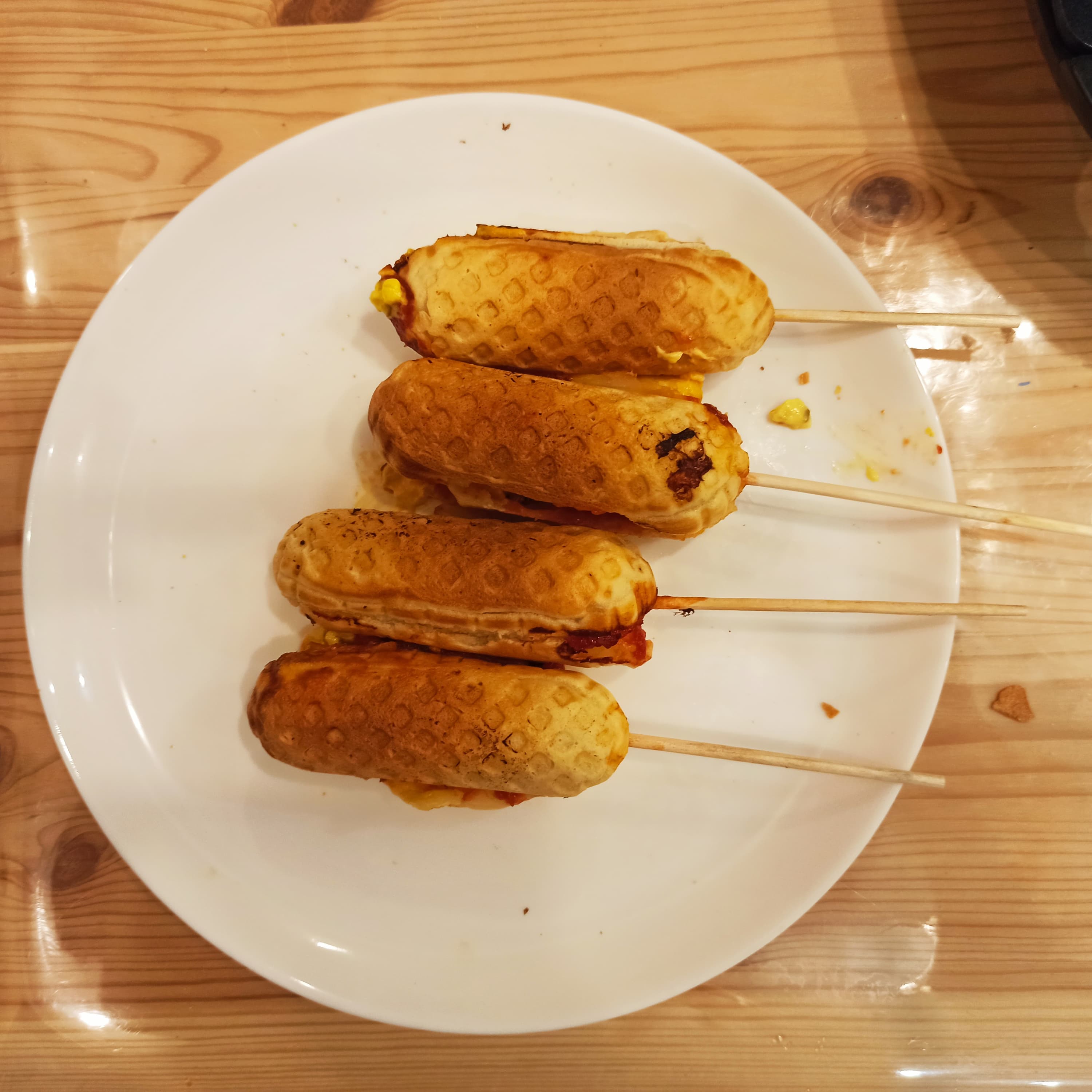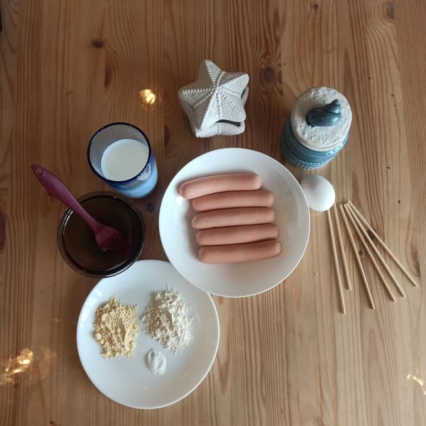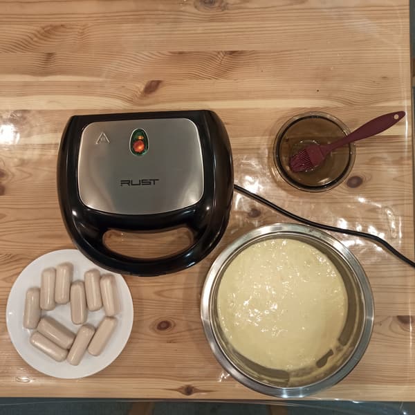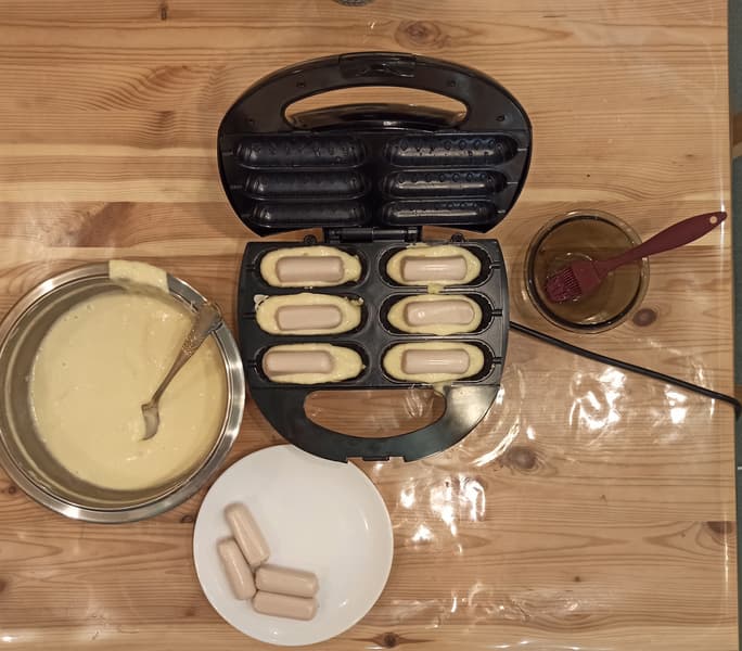 Еще один базовый для нашего прибора рецепт, который мы решили попробовать — корн-доги. Традиционно они изготавливаются путем нанизывания сосисок на палочку и макания их в тесто, которое должно содержать кукурузную муку. Для данного рецепта мы взяли сосиски традиционного размера и использовали в приготовлении теста два вида муки — пшеничную и кукурузную.