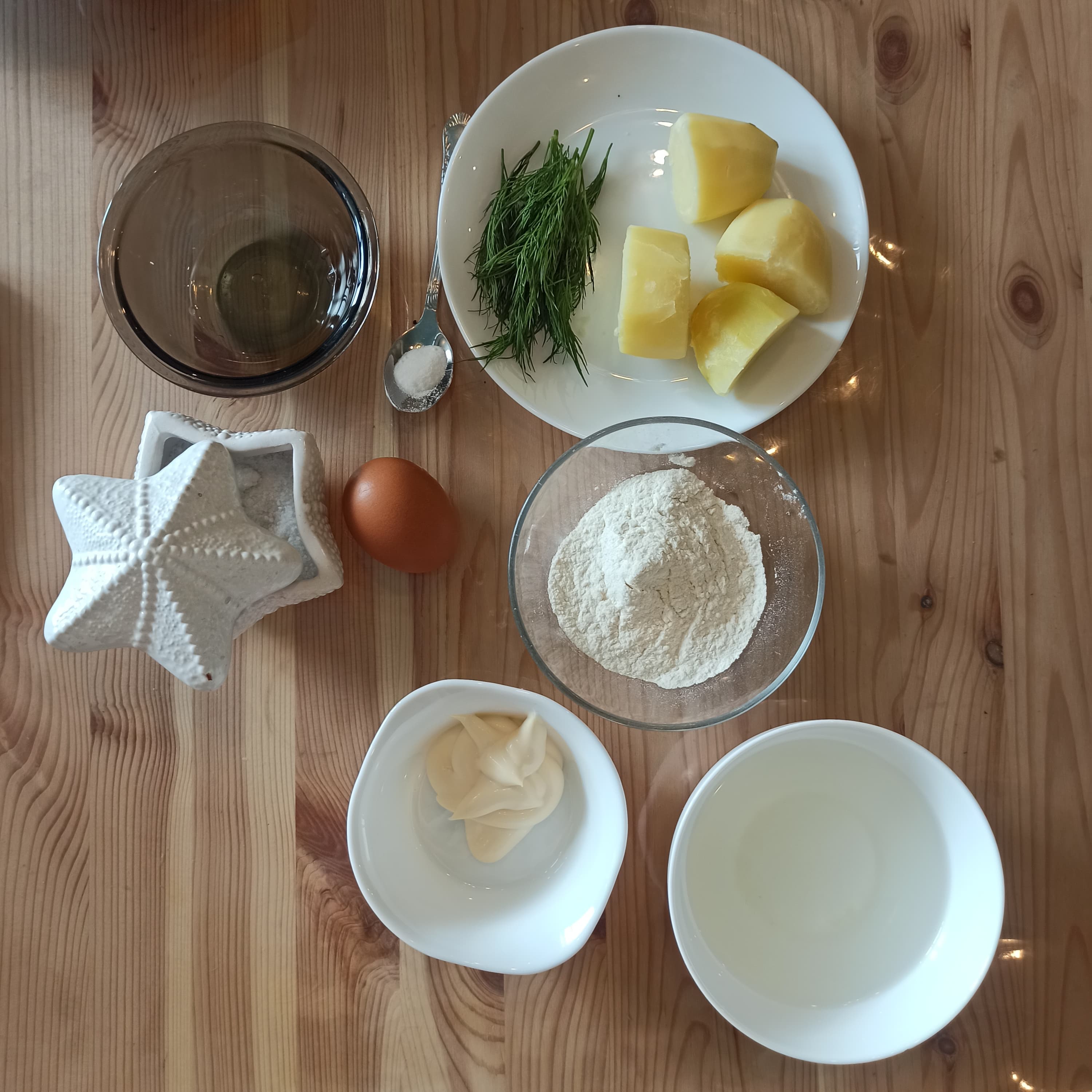Затем размяли картофель и, добавив в тесто яйцо, немного муки, соли и соды, майонеза и зелени укропа, замесили тесто.