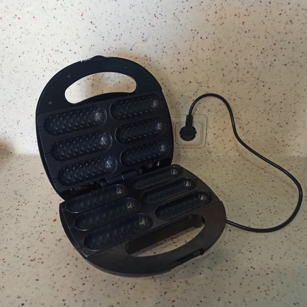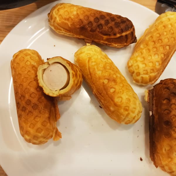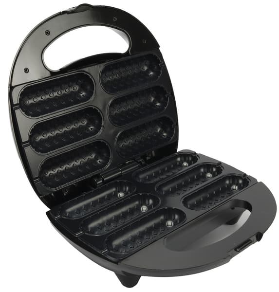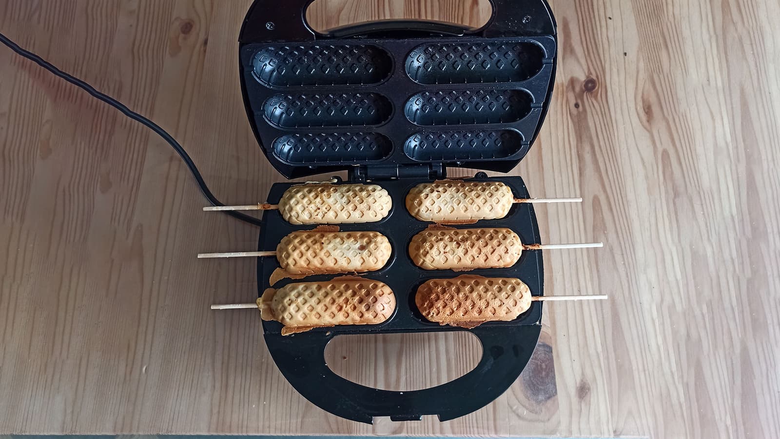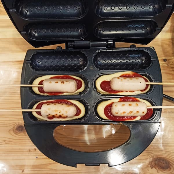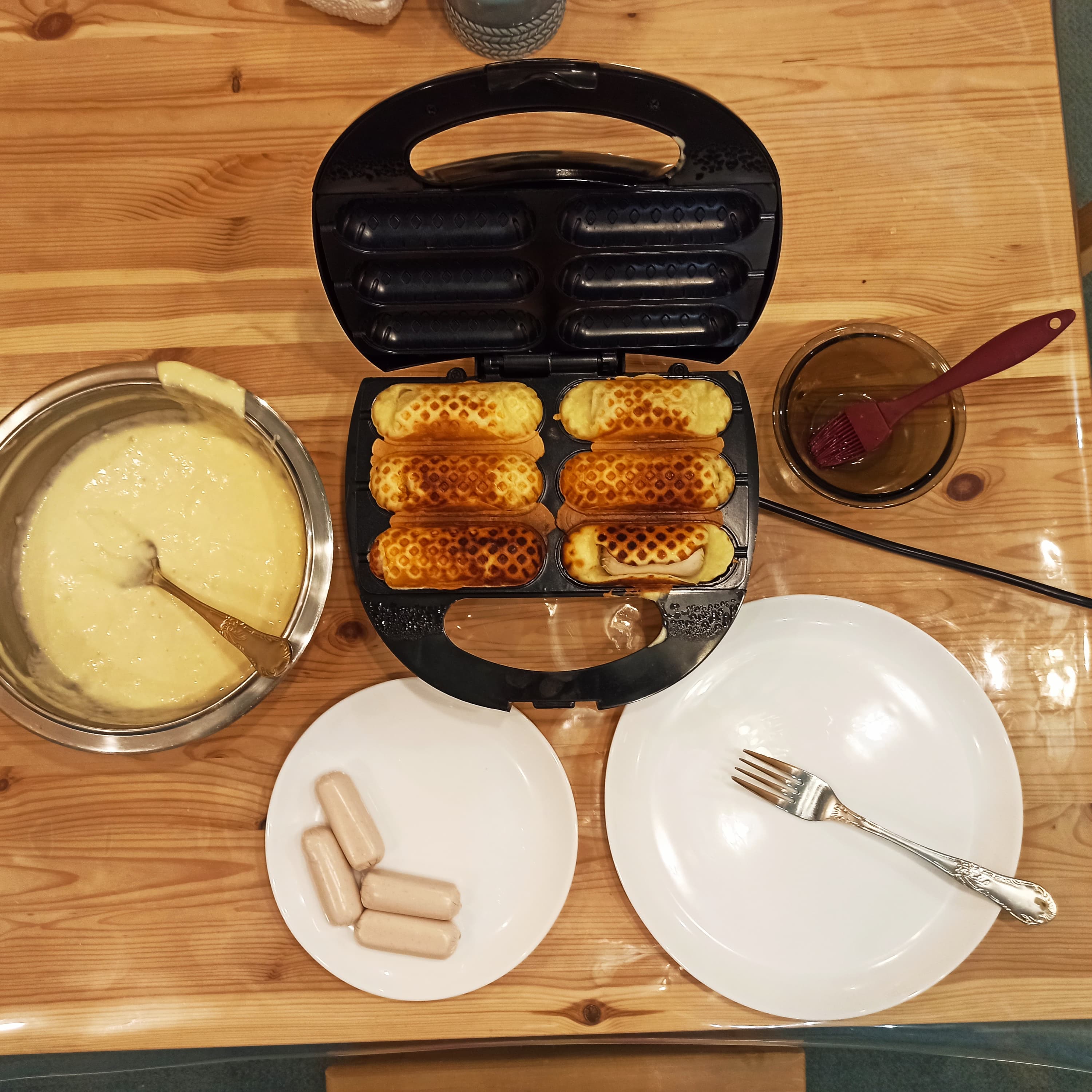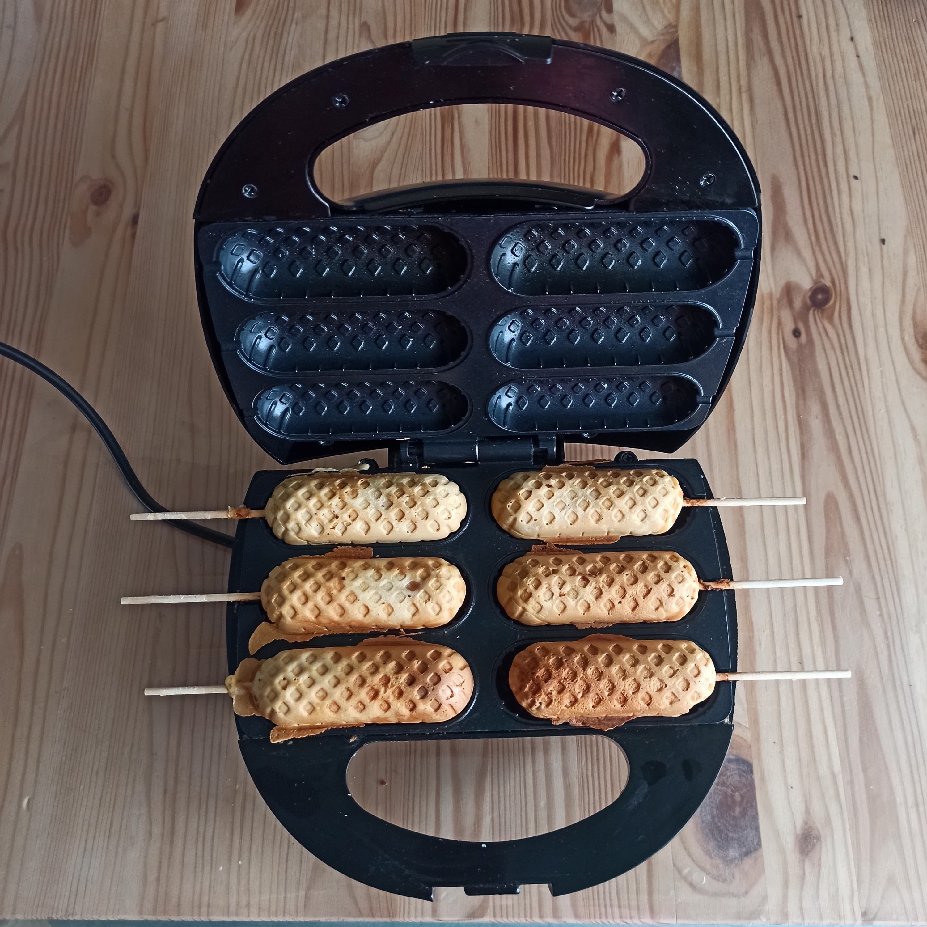 - для приготовления корн-догов (сосисок на палочке) — тогда сосиску, надетую на деревянную шпажку, сначала окунаем в тесто, затем кладем ее в аппарат, закрываем верхнюю панель и запекаем до готовности