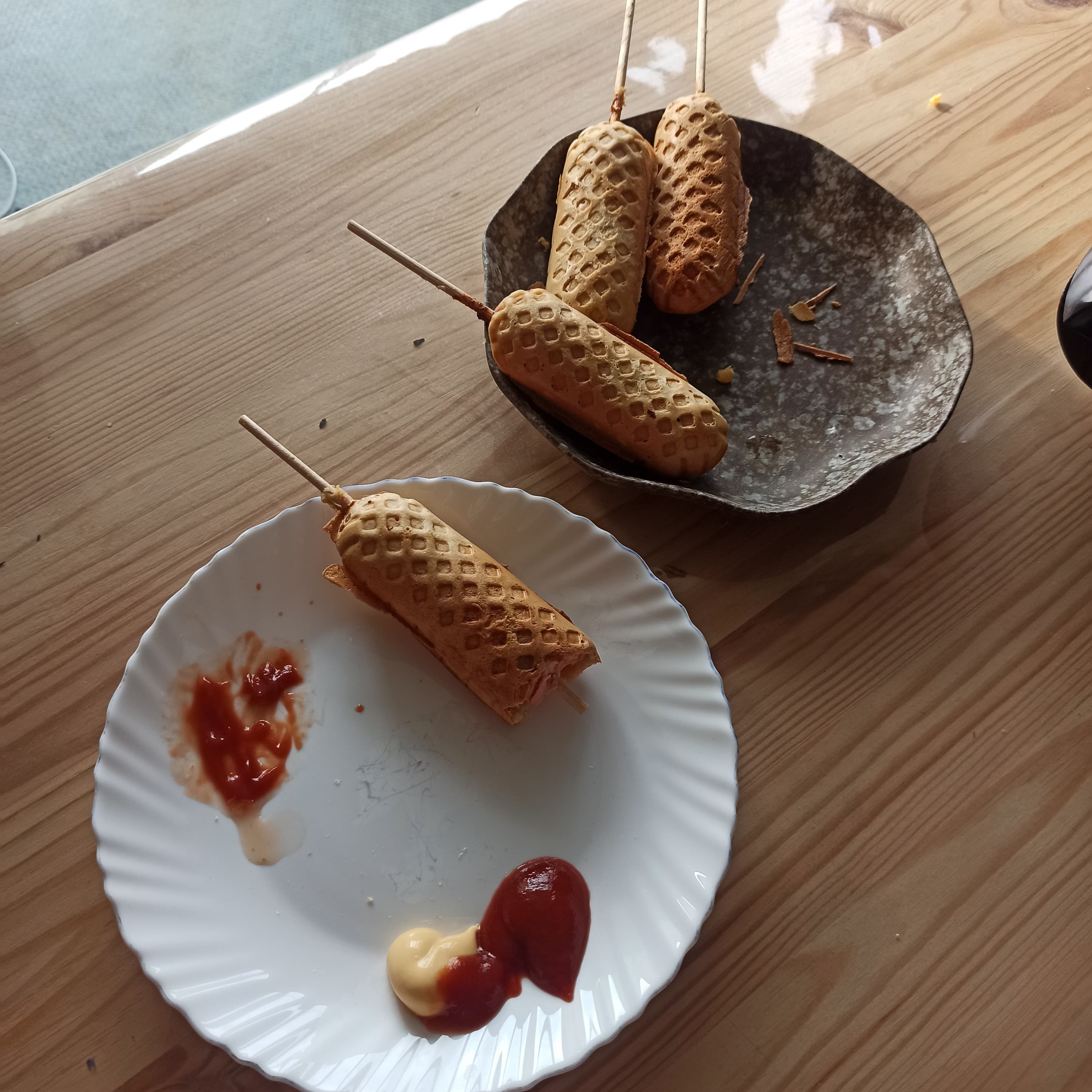 Внешне заметна некоторая неравномерность в степени пропеченности, но это оказалось некритично для вкуса. Выпечка корн-догов заняла 8 минут.