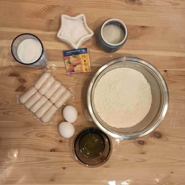 Базовый рецепт теста для хот-догов мы замесили из простых продуктов, сосиски нашли максимально подходящего размера (детские).