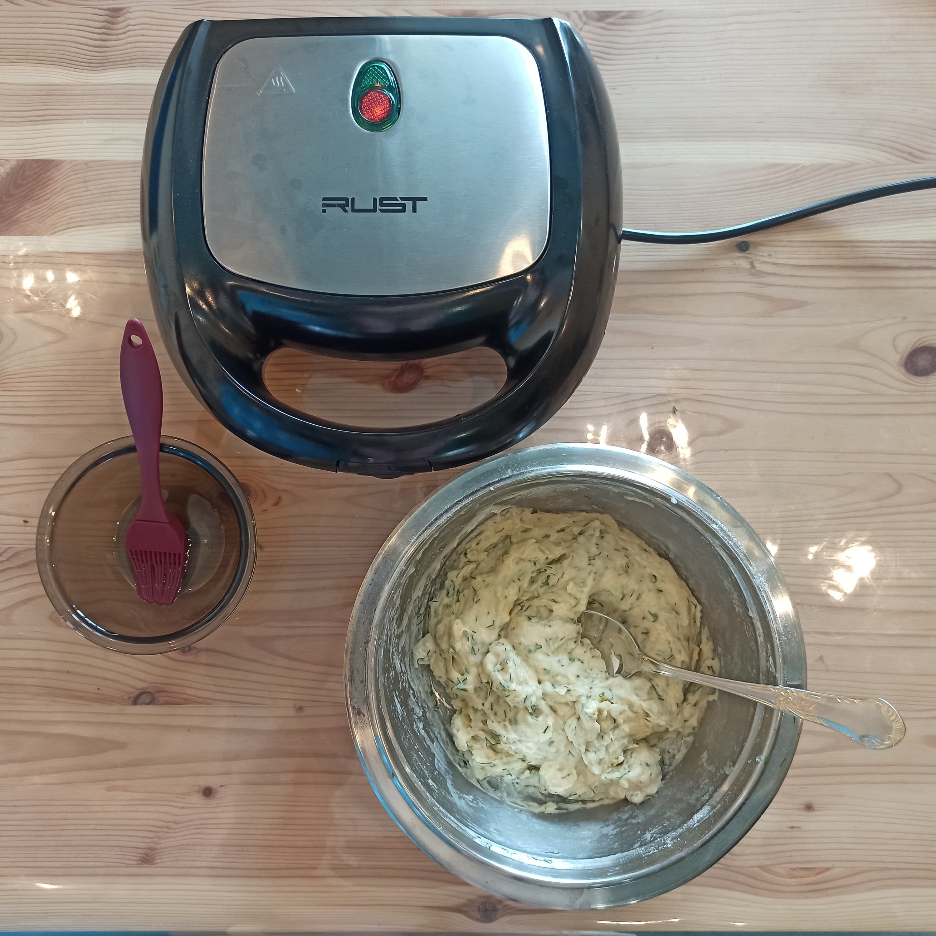 Замесив достаточно густое тесто, включили прибор в сеть и стали ждать, пока отключится верхний индикатор нагрева и аппарат будет готов к работе.
