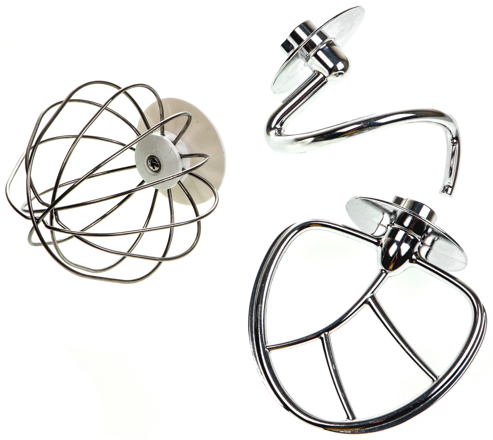Насадки представлены типовым набором: венчик для взбивания, лопатка для смешивания и крюк для замеса плотного теста. Форма их стандартна. Лопасти венчика изготовлены из стали, основание — из пластика. Две другие насадки цельнолитые силуминовые. Верхняя часть и крюка, и лопатки оснащены круглой плоской пластиной для защиты приводного вала от загрязнения во время взбивания или замеса теста. Диаметр этой защитной части 7 см. Обратим внимание на форму крюка — на его кончике имеется небольшой приплюснутый элемент. Такая форма предназначена для лучшего захватывания комка и более эффективного замеса плотного теста.