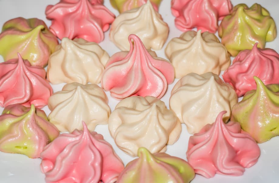 Разделили крем на три части. В одну добавили каплю красного красителя, в другую — зеленого, третью часть оставили белой. С помощью кондитерского мешка отсадили меренгу на противень, проложенный пергаментом.