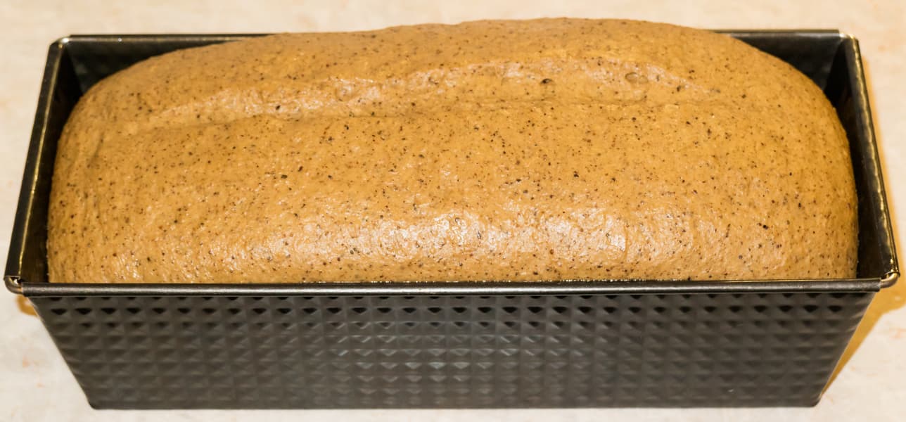 Через 40 минут обмяли увеличившееся в объемах тесто и переложили его в форму, смазанную растительным маслом. Накрыли пленкой и поставили на вторую расстойку в духовку, нагретую до 35 °C. Через некоторое время, когда тесто поднялось во второй раз, вытащили форму из печи и включили нагрев.