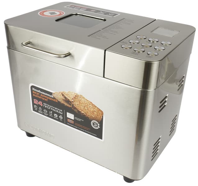 Максимум возможностей и минимум недостатков — такой итог тестирования у нас получился. Из предустановленных 25 программ (9 для разных видов хлеба, в том числе безглютенового и цельнозернового) мы испытали 5, причем некоторые не по одному разу, и результаты нас очень порадовали. Модель выпекает буханки весом от 500 г до 1 кг — и делает это прекрасно. Важно, что в комплект входит красочная книга рецептов, где можно найти 101 рецепт самых разных адаптированных именно для этой хлебопечки блюд (хлеб, сдоба, бисквит, йогурт, варенье, первые и вторые блюда). Да, отчасти прибор может заменить мультиварку и при необходимости приготовить суп, варенье или гуляш — правда, небольшое количество, и это, скорее, баловство. Для тех, кого не вполне устраивают автопрограммы, есть режим Мультипекарь, позволяющий установить продолжительность каждого из этапов приготовления хлеба (замеса, расстойки и выпечки) на свое усмотрение. Заметим, что у модели удобный интерфейс и пронумерованный перечень программ написан прямо на корпусе, так что пользоваться ею сможет даже неопытный человек.